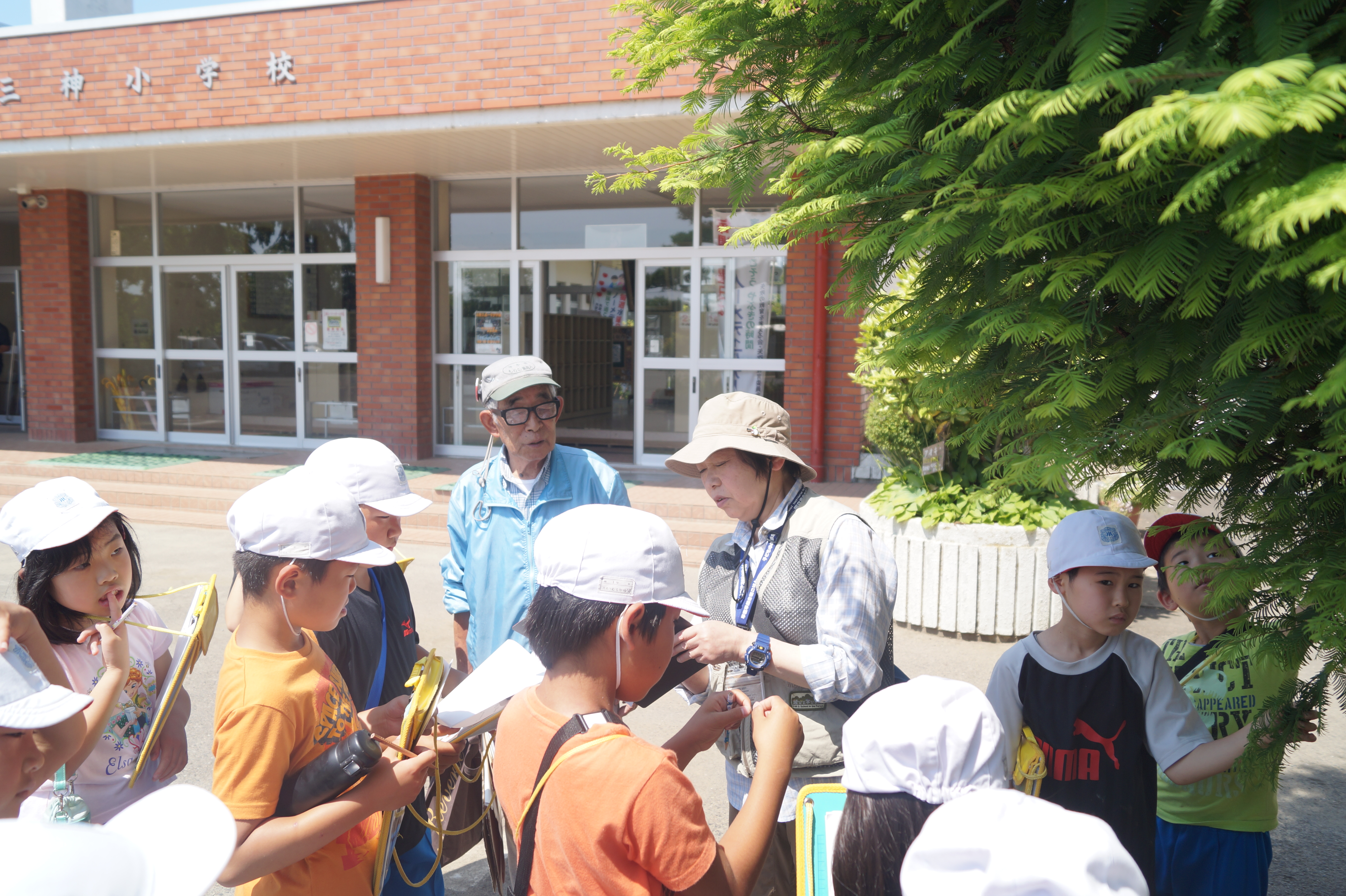 そのような自然豊かな環境を生かし、3年生の総合学習では、学校のまわりの樹木をもっと知ろうというねらいで、「もりの案内人」を講師として招き、樹木観察を行いました。