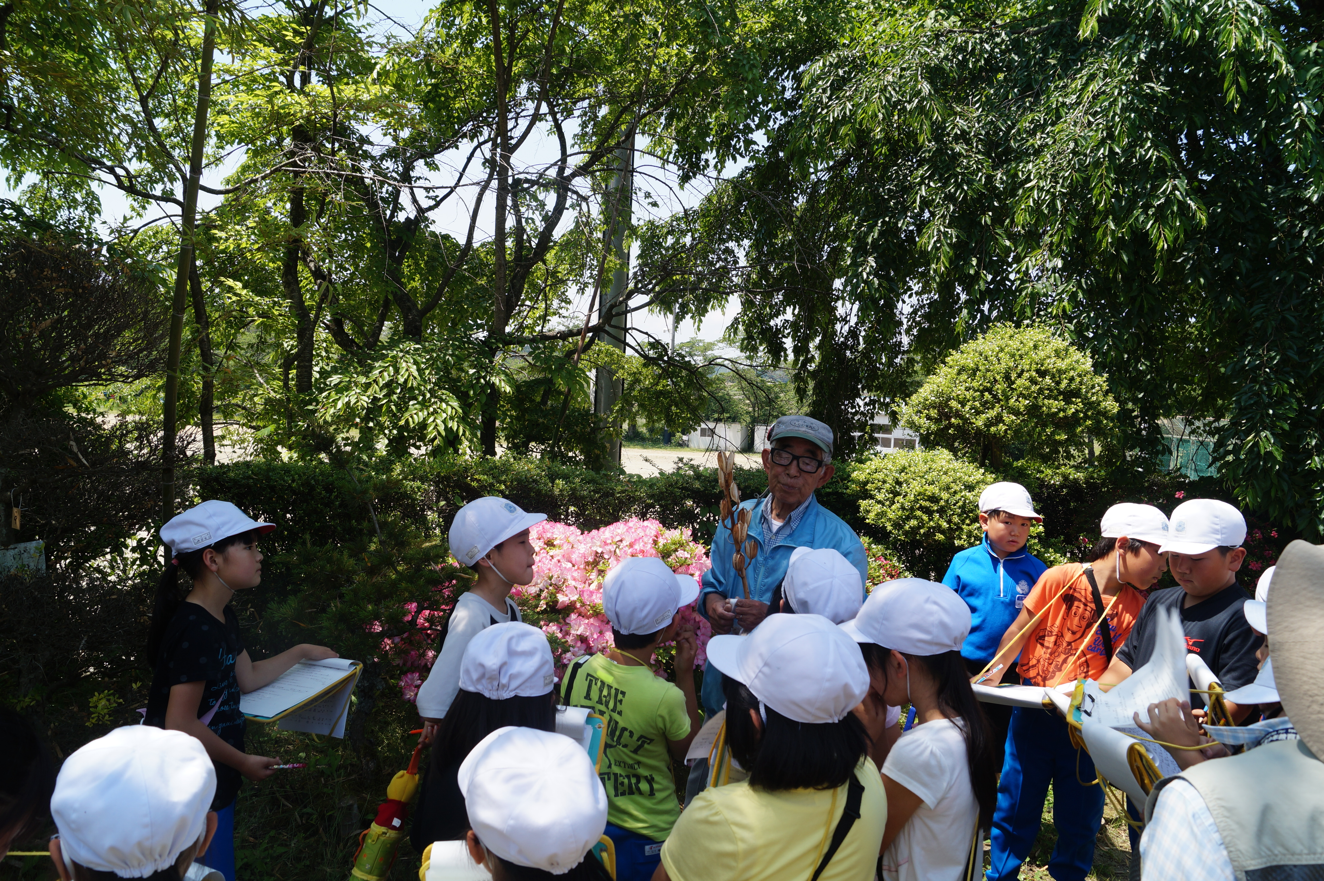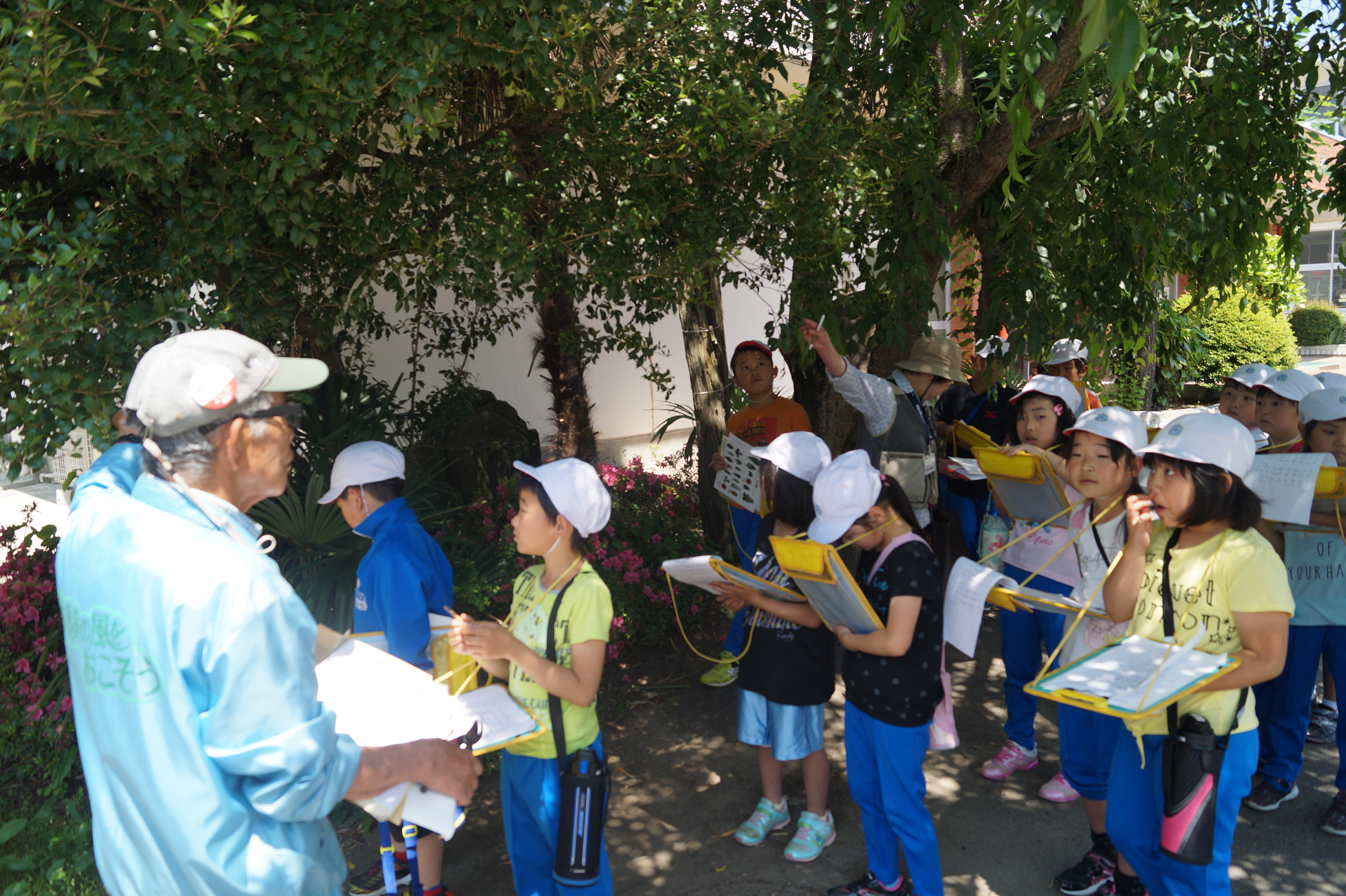 今まで何気なく見ていた樹木の名前や種類、特徴などを教えていただき、子どもたちは、メモを熱心に取りながら樹木に対して興味を高めていきました。