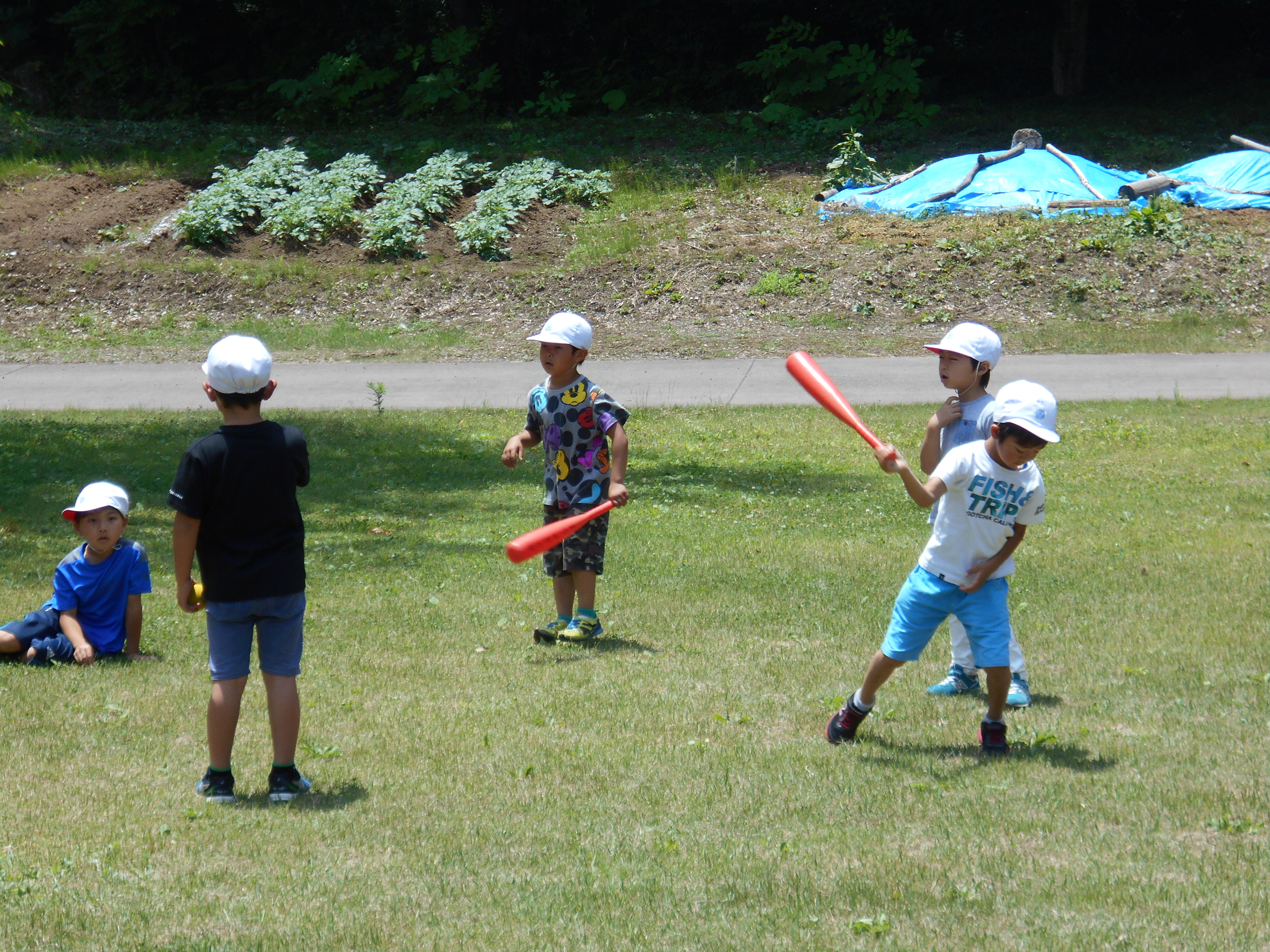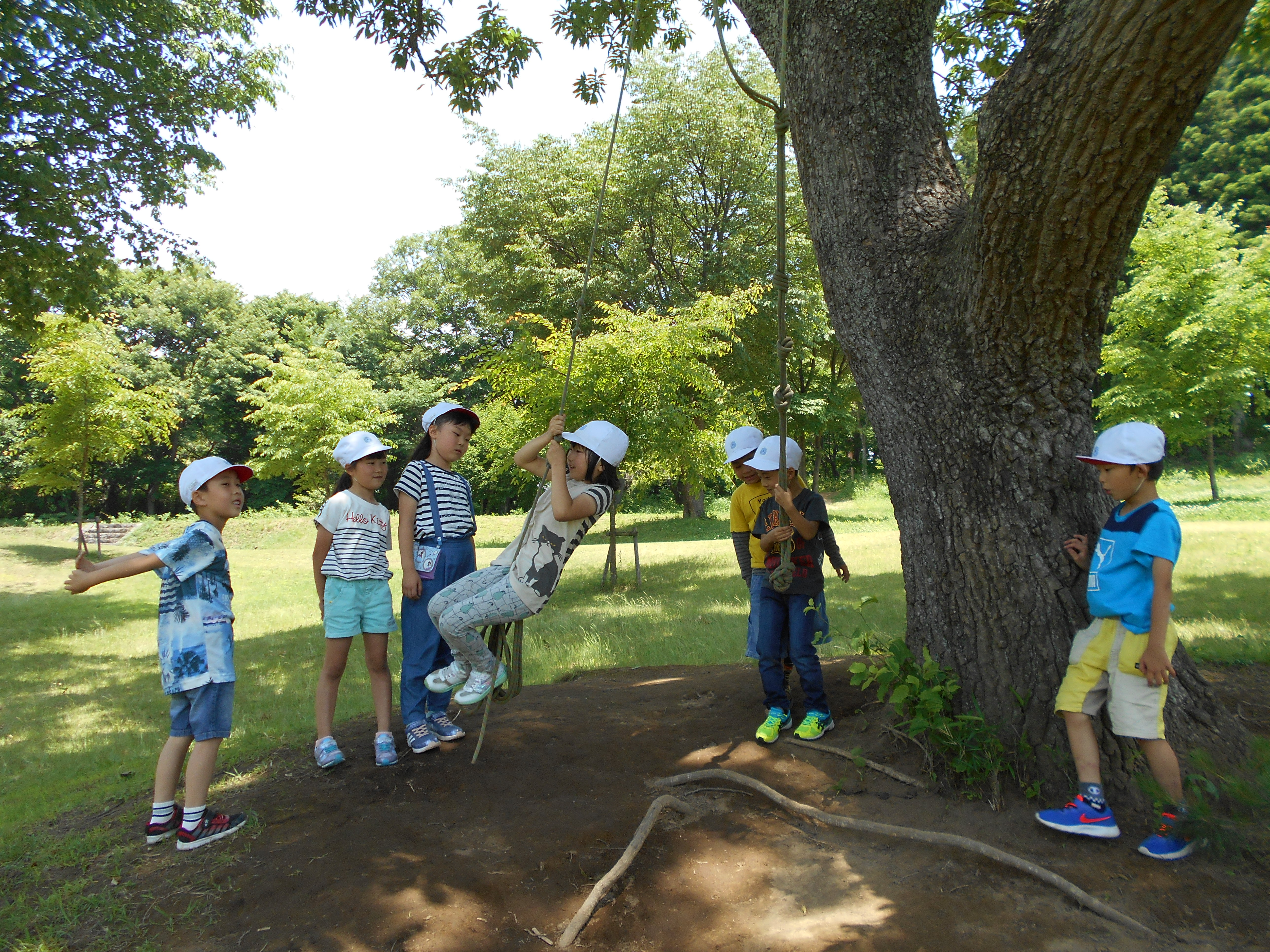 南湖森林公園では、天候にも恵まれ、芝生の上を段ボールですべったり、キャッチボールをしたり、長縄をしたりと、子ども達が思い思いに遊びを楽しみました。遊んだ後には、お家の人が作ってくださった、おいしいお弁当、持ってきたお菓子も食べることもでき、とても楽しい時間を過ごすことができました。