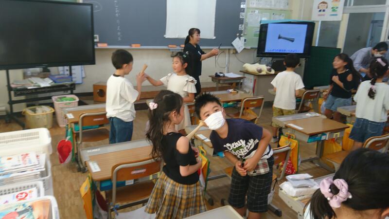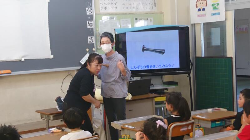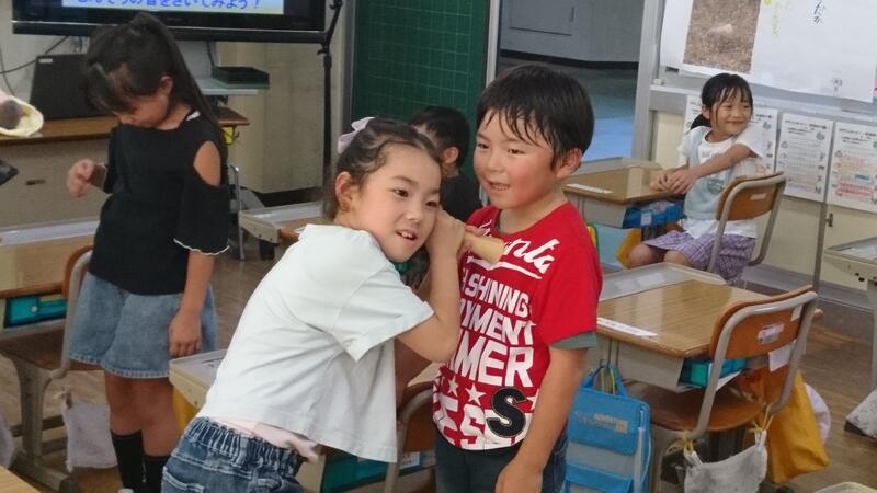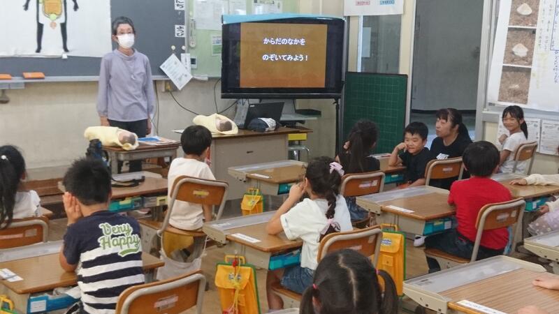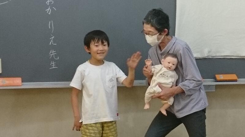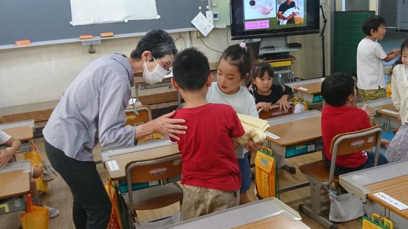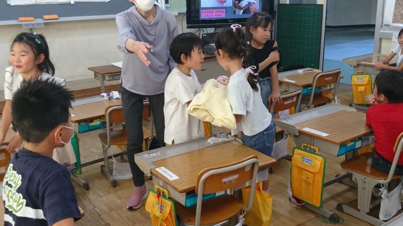初めに「生きている?」とはどういうことか,について考え,呼吸することの元になる心臓の音を友達とお互いに聞き合いました。心臓の音にたくさんの子どもたちが感動していました。その後,呼吸の始まりについて考え、誕生した赤ちゃんの呼吸について教えていただき,実際の新生児と同じサイズ(身長,体重)の人形を抱き,赤ちゃんの命の重さを体感しました。子どもたちは,その重さに驚き,落とさないように注意して抱っこし,次の人へ渡していました。その後,自分たちが新生児からどれだけ成長したか,実際に大きさを比べて実感しました。