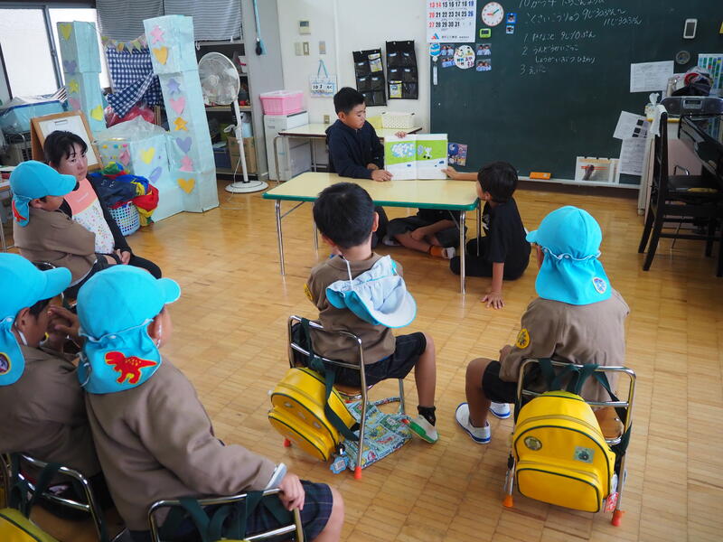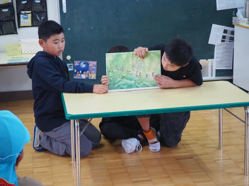 図書委員会の子どもたちは2回目とあって,だいぶ慣れた調子で読み聞かせをし,幼稚園児たちも集中して聞いていました。