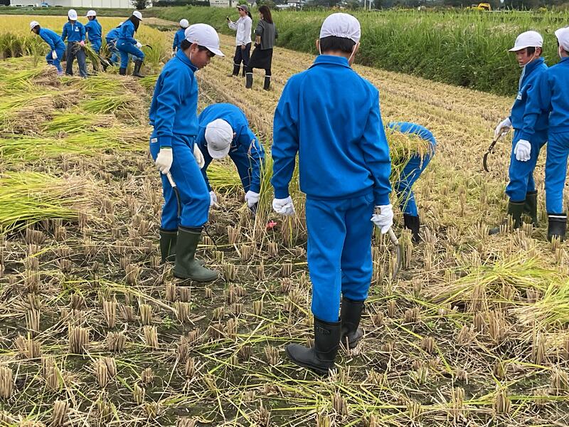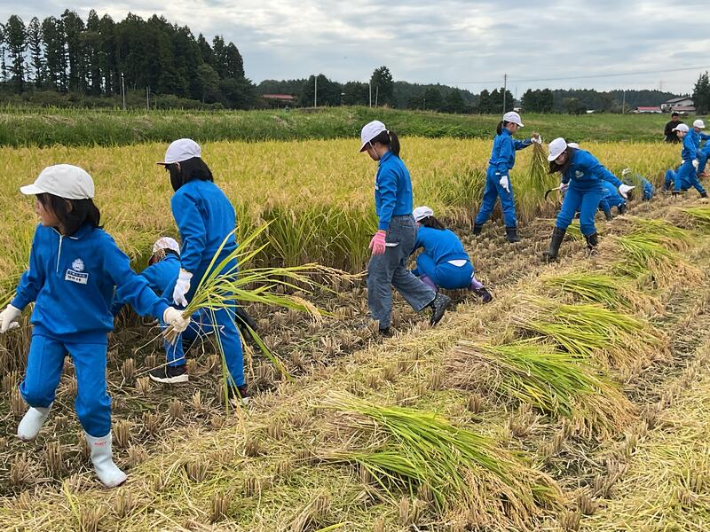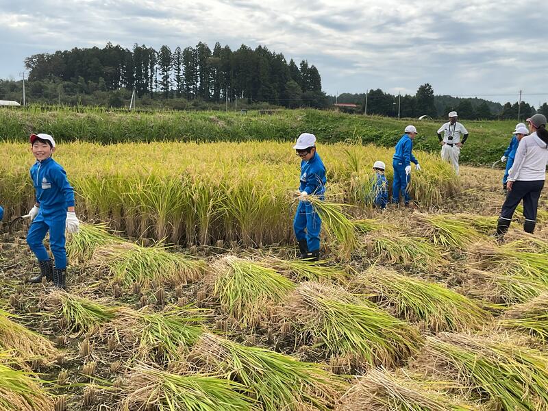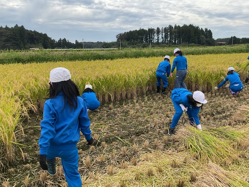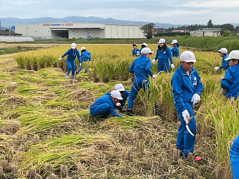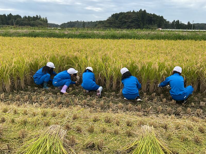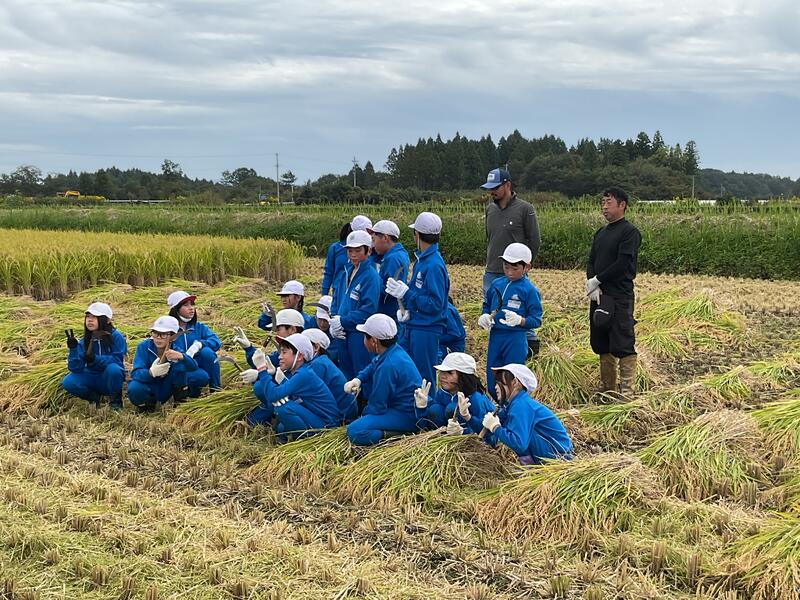 田植えの時と同様に,農青連の藤井さんやJA夢みなみの鈴木さん,田んぼの持ち主の菅野さんに稲刈りの仕方や注意することを指導していただき,5年生の子どもたちは作業を開始しました。