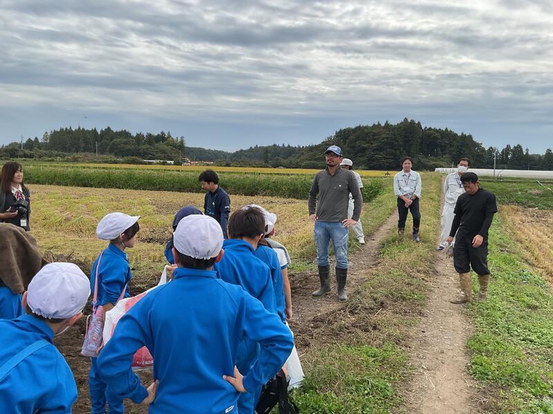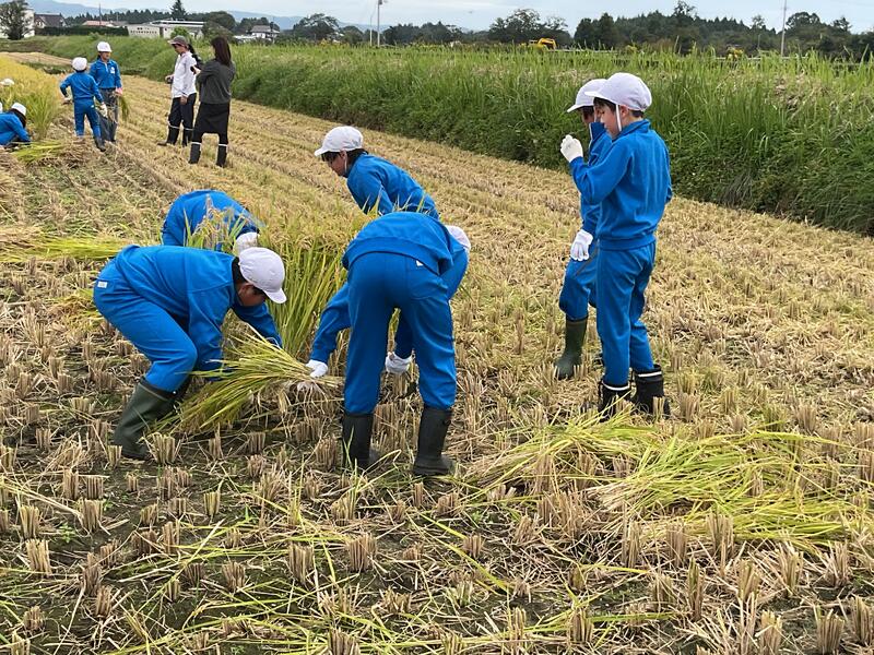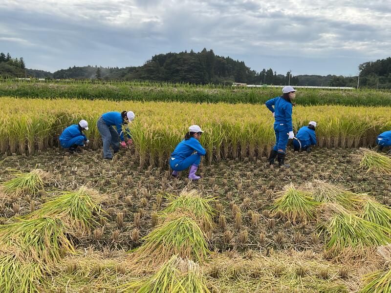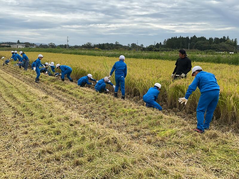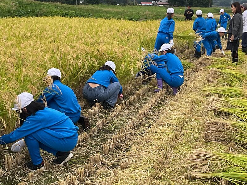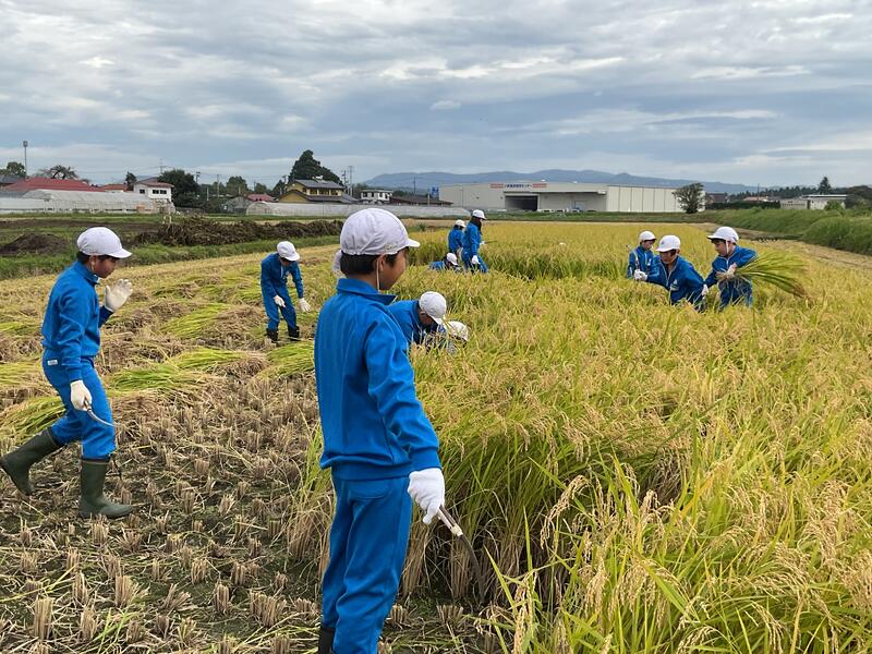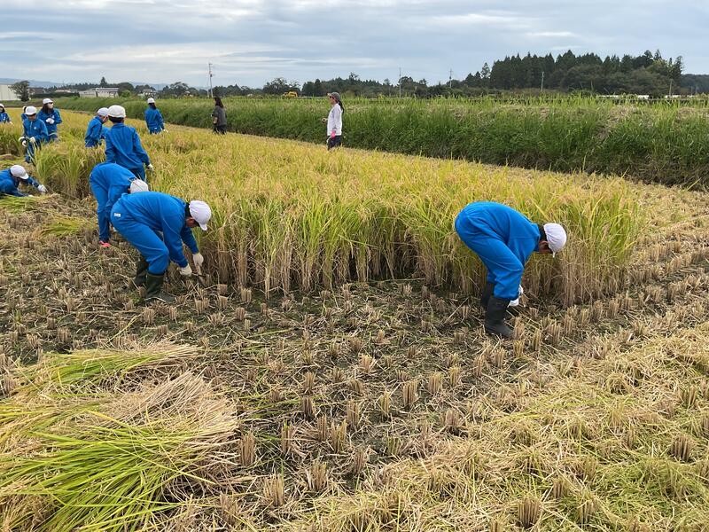 田植えの時と同様に,農青連の藤井さんやJA夢みなみの鈴木さん,田んぼの持ち主の菅野さんに稲刈りの仕方や注意することを指導していただき,5年生の子どもたちは作業を開始しました。