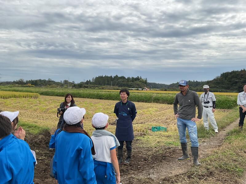 6月14日(金)に田植えを行った菅野さん方の田んぼで,稲が大きく育ち,黄金色の実を付け,収穫の時を待っていました。