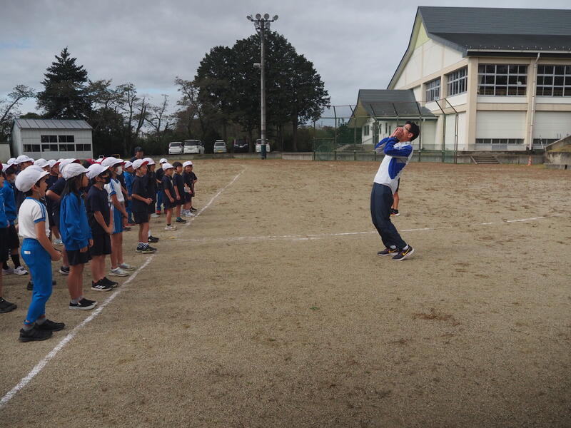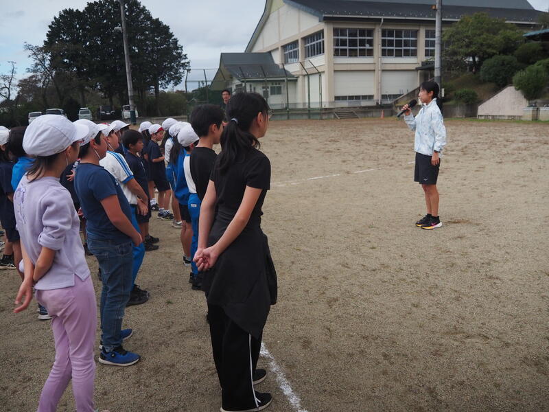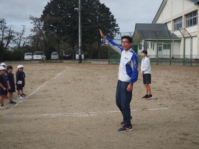 10月22日(火)の業間運動では,持久走記録会に向けてのマラソンに取り組みましたが,今年度も,マラソン指導の講師の先生が来校されました。矢吹町学校ボランティアの長谷川さんと矢吹町駅伝チームの小林さんです。実際に走る前に,走るときの気持ちや走るときの姿勢・構え,走っているときの注意点などについて細かく指導を受けました。