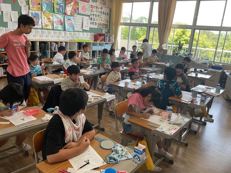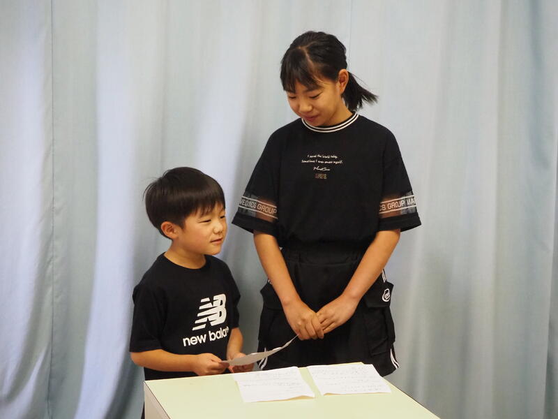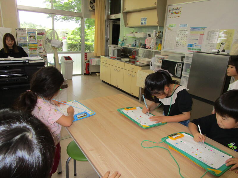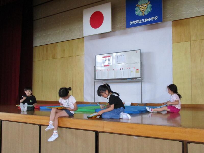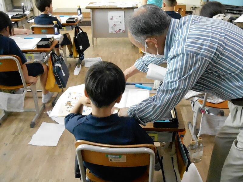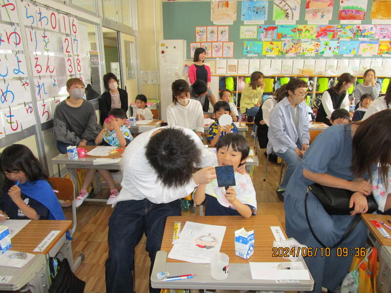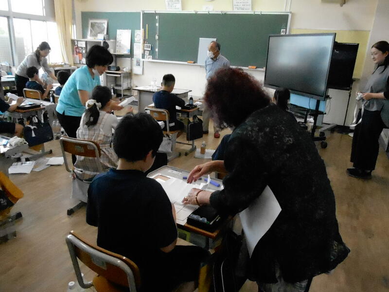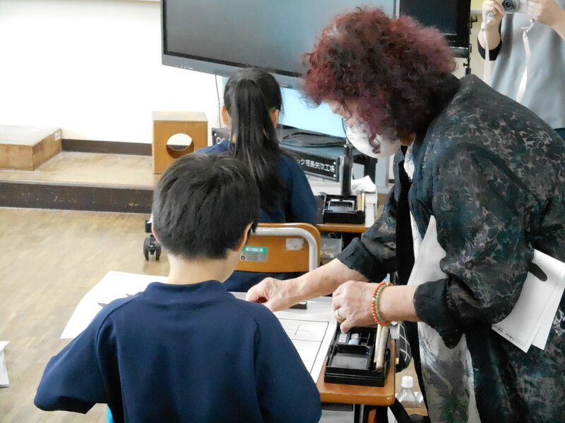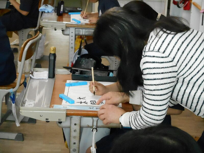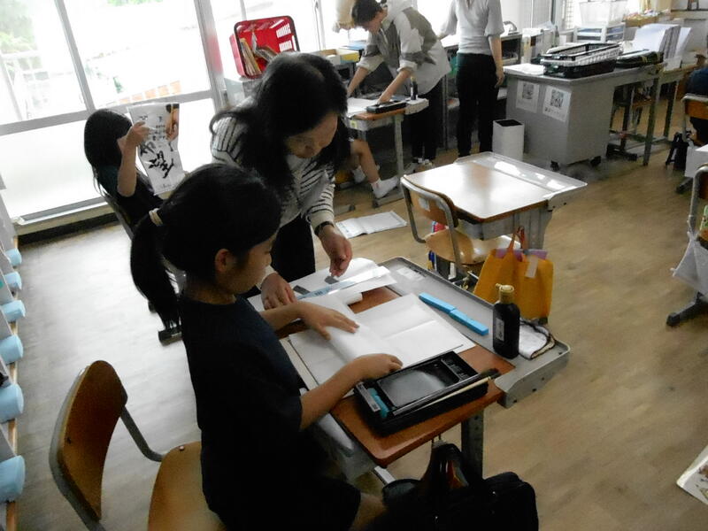 子どもたちは,半紙の使い方や筆遣い,自分の名前の書き方など,書写(毛筆)の基本的なことを教えてもらったり,手伝ってもらったりして,真剣に学習することができました。