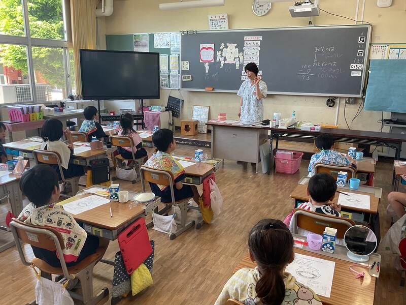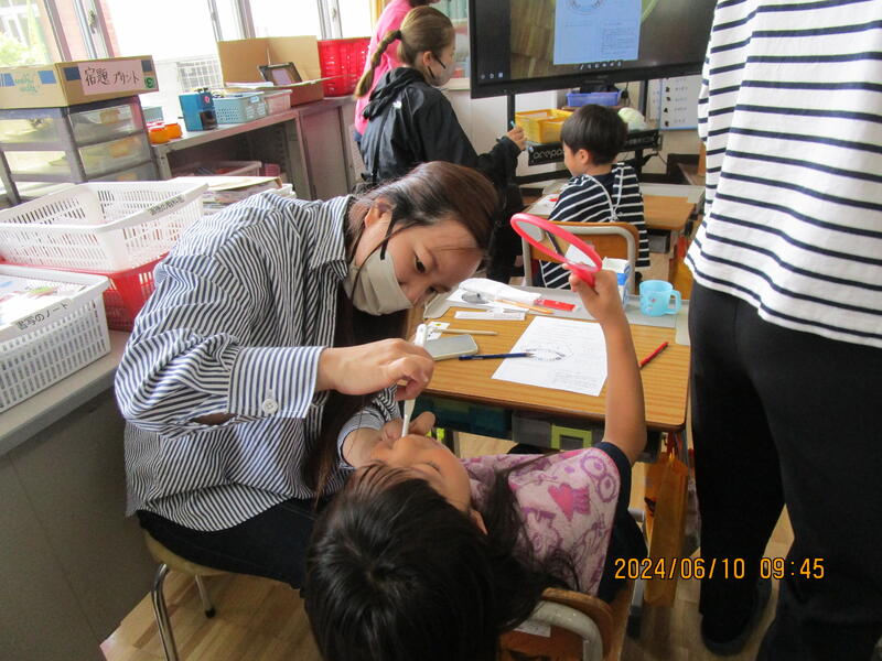 6月10日(月)には,町の歯科衛生士さんの宮本陽子さんが来校してくださり,1年生と5年生の子どもと保護者向けに,歯みがき教室を開催しました。