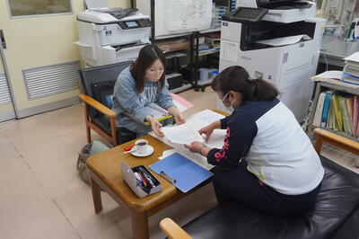 5月17日(火)の放課後に、今年度から配置された「地域学校協働活動推進員」が来校し、3年生の工場見学について打ち合わせを行いました。
