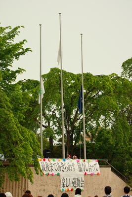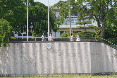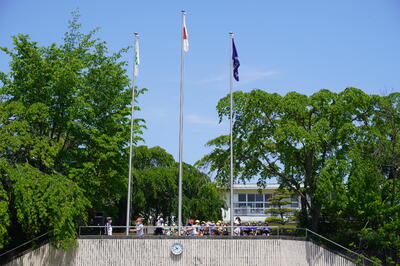 掲揚塔の後ろにいるのは、三神幼稚園の子どもたちです。