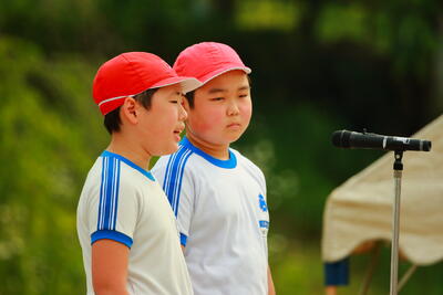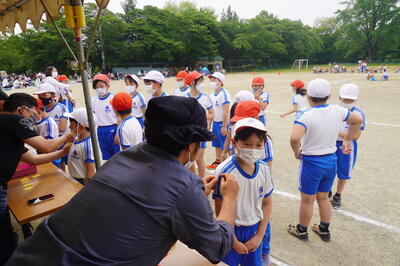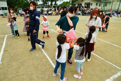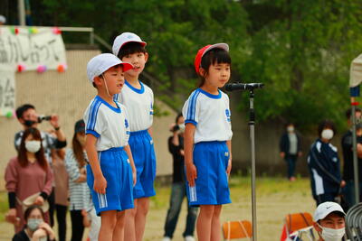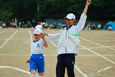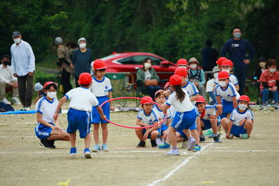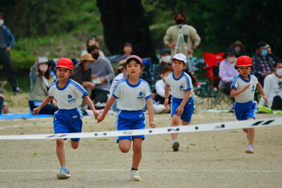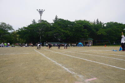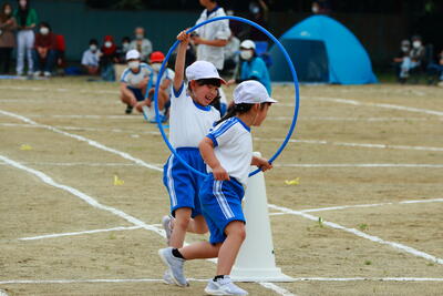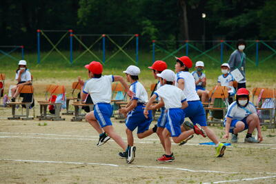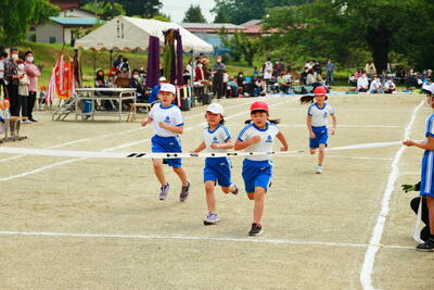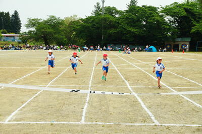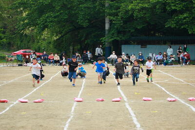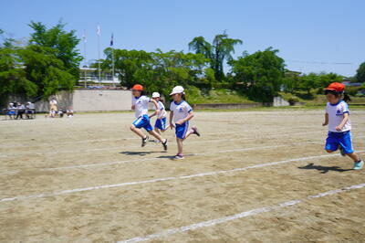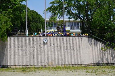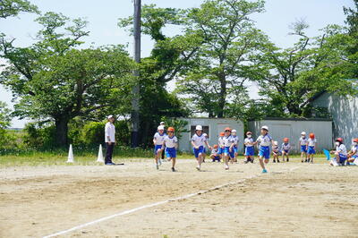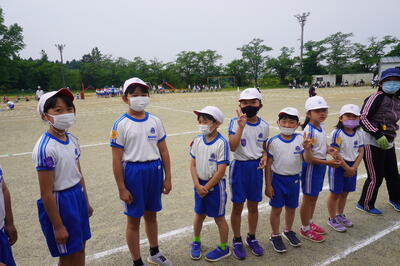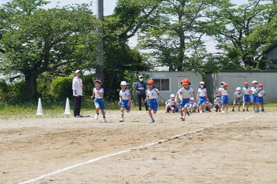 1・2年生の徒競走の練習中、幼稚園の子どもたちが、たくさんの声援を送ってくれました。