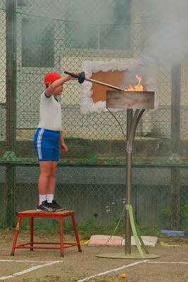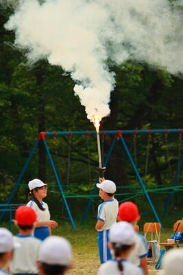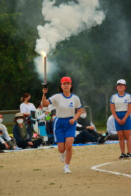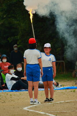 6年生4人による聖火リレー。友情の火が聖火台に灯されました。