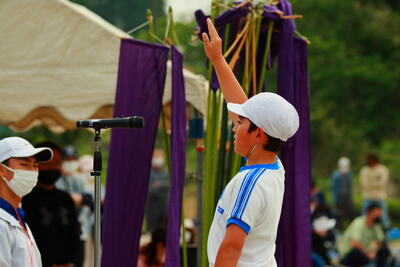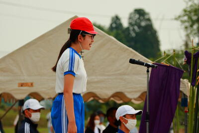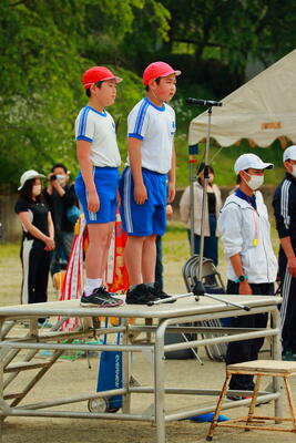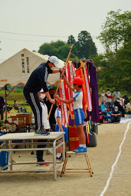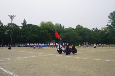 昨年度優勝した紅組から、優勝旗の返還がありました。昨年度は、大接戦の末、紅組が5点差で勝利を収めました。さて、今年度、優勝旗を手にするのは、紅か白か・・・