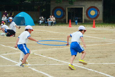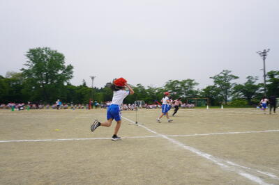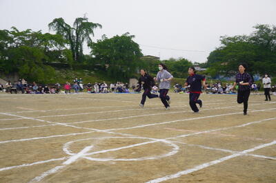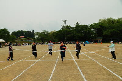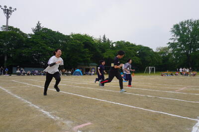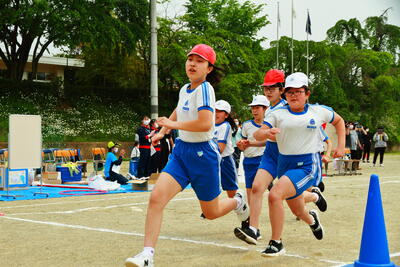 5・6年生により借り物競争でした。カラーコーンやリレーのバトン、家族や先生方ボランティアの人、かつらや教頭先生の帽子など、様々な借り物を探して、楽しそうにゴールしました。
