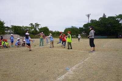下学年の子どもたちは、担任の先生方が声をかけてバトンパスの練習を繰り返し行っていました。