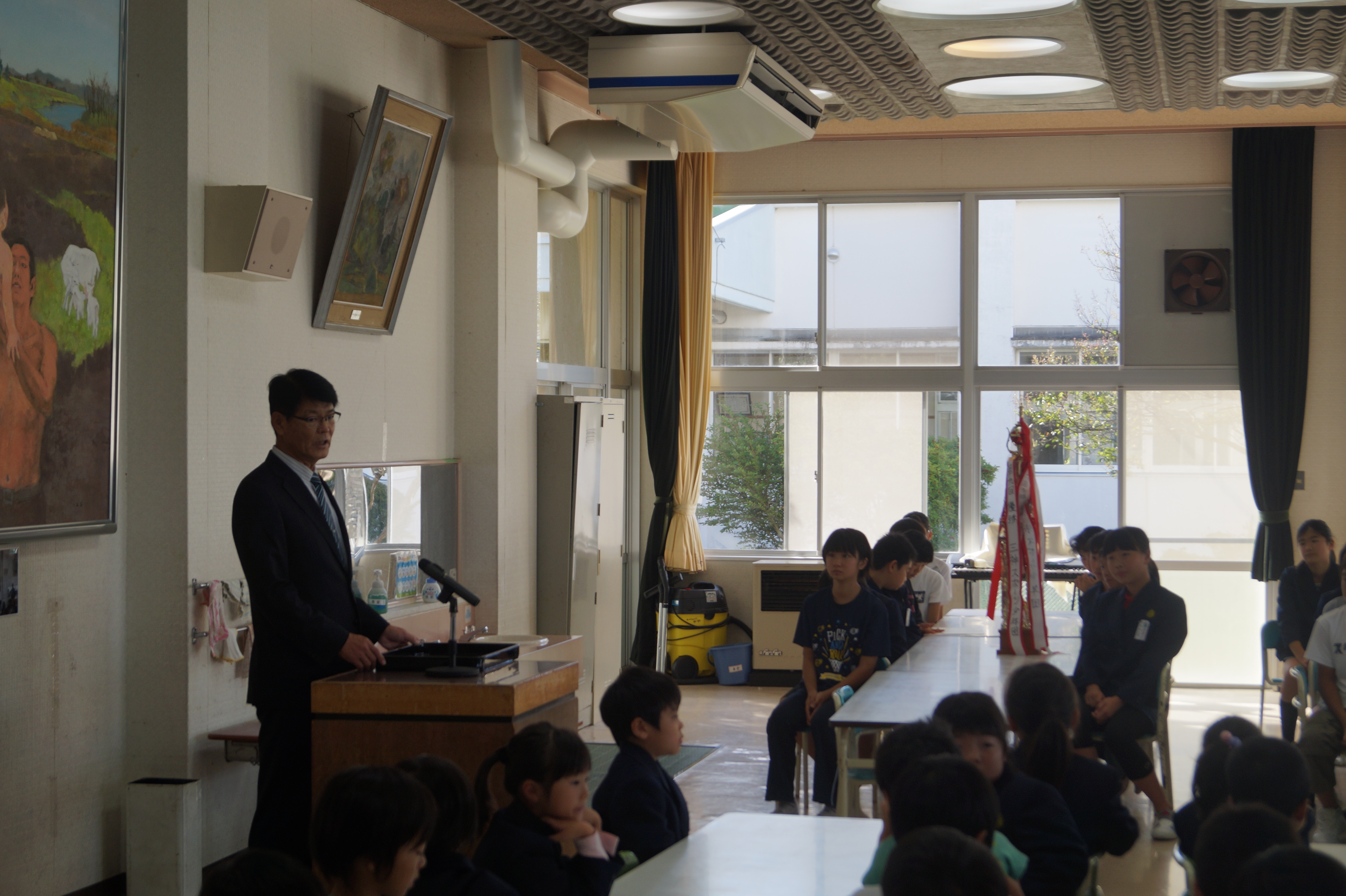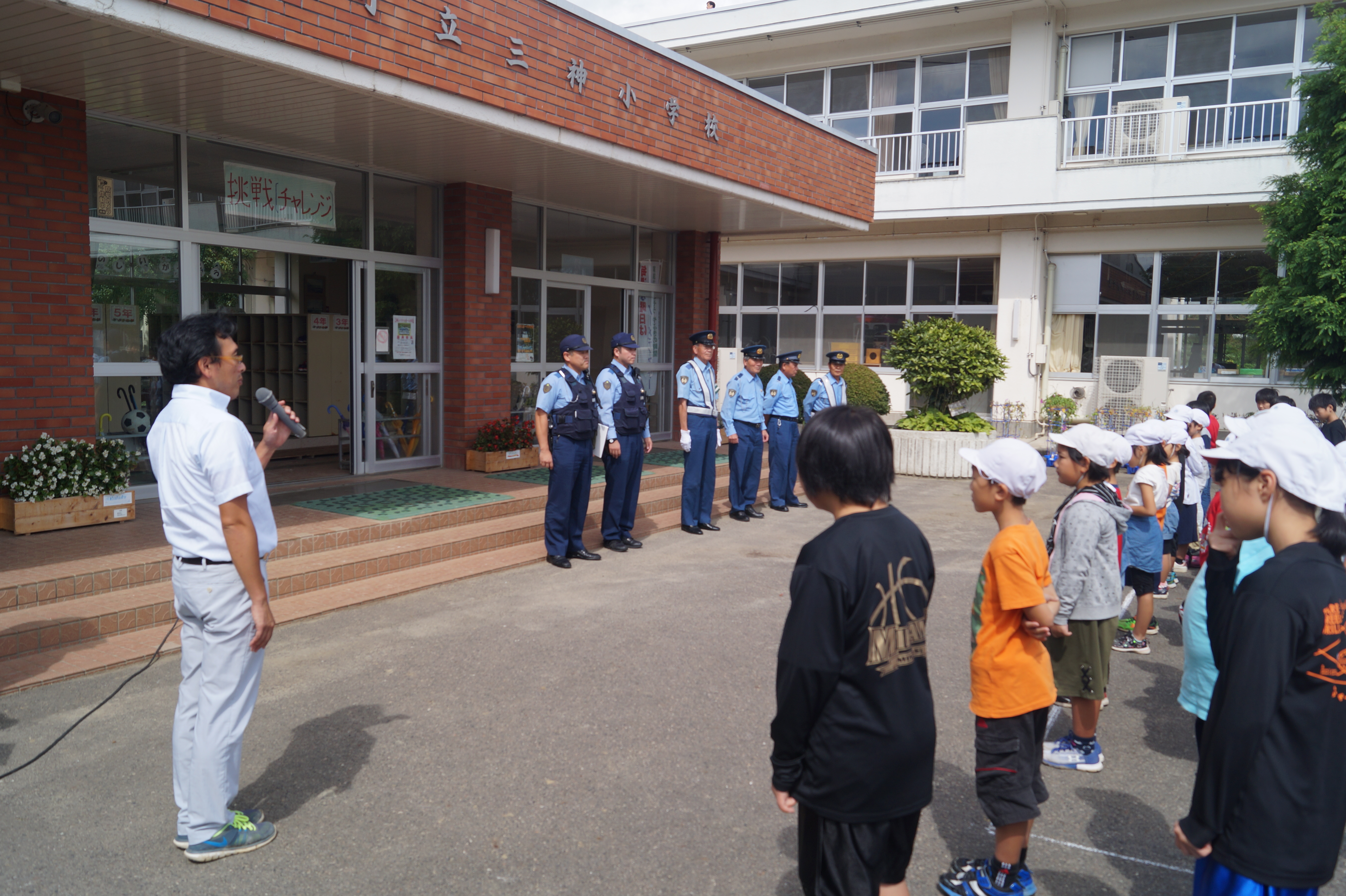 安全集会が行われ、担当の先生から3つのお話をしていただきました。1つ目は、台風の影響が心配されるため、むやみに川に近づかないこと。2つ目に、安全な登下校を継続するとともに、朝の登下校も含め朝の挨拶をより意識して行うこと。3つ目に、自分の身を守るために防犯ブザーの点検を行い、ランドセルにしっかりつけることについてお話をいただきました。