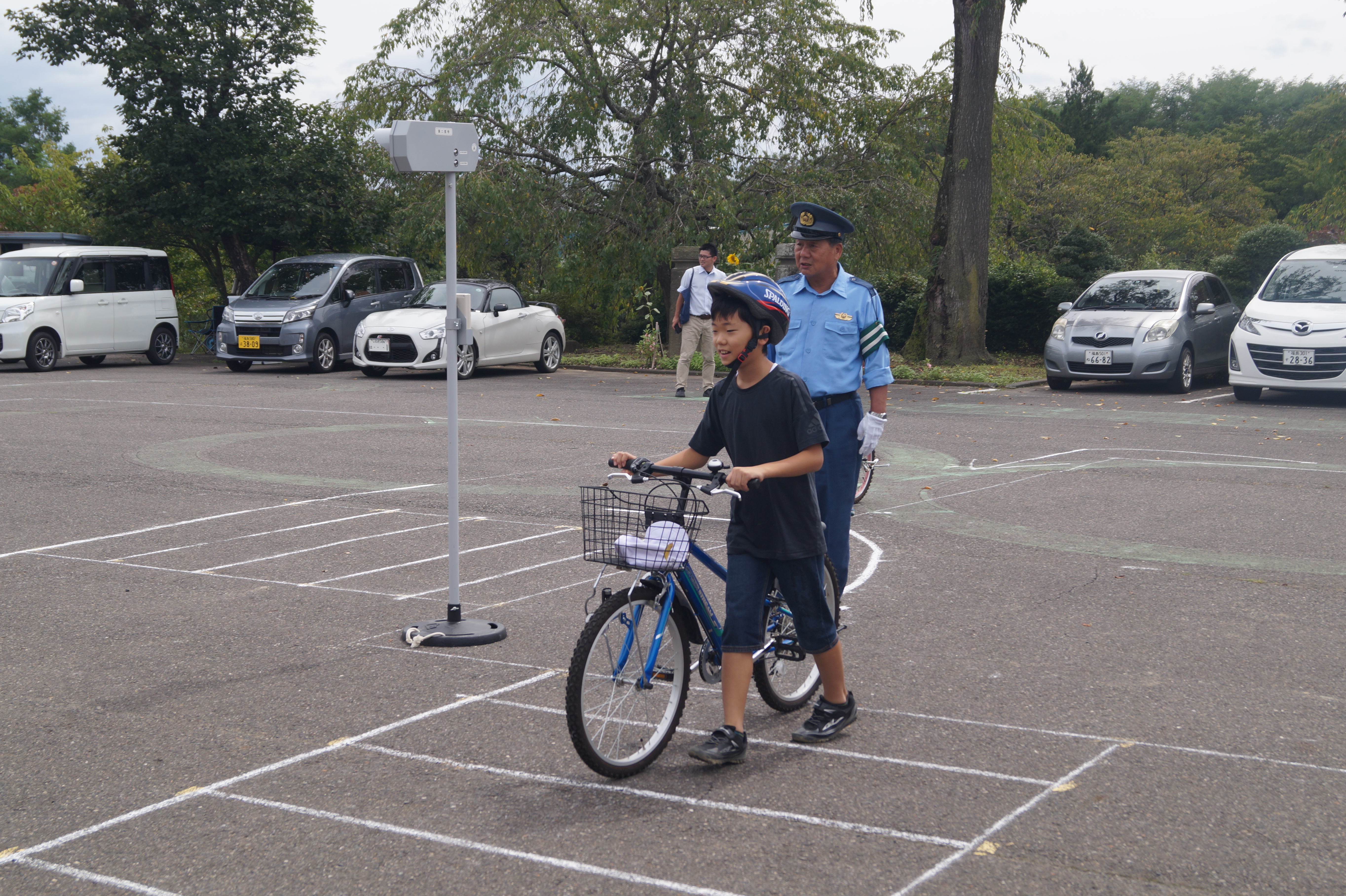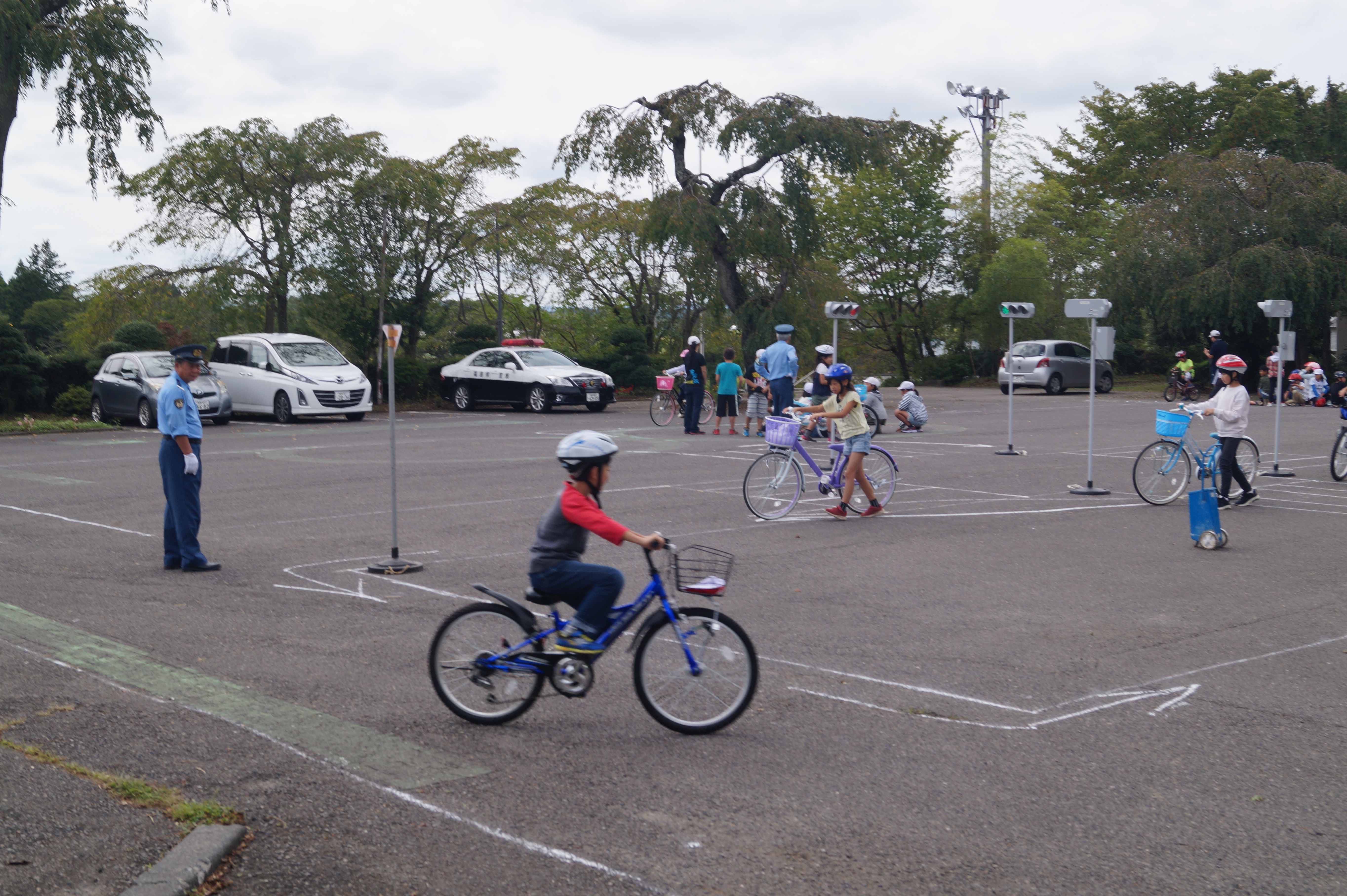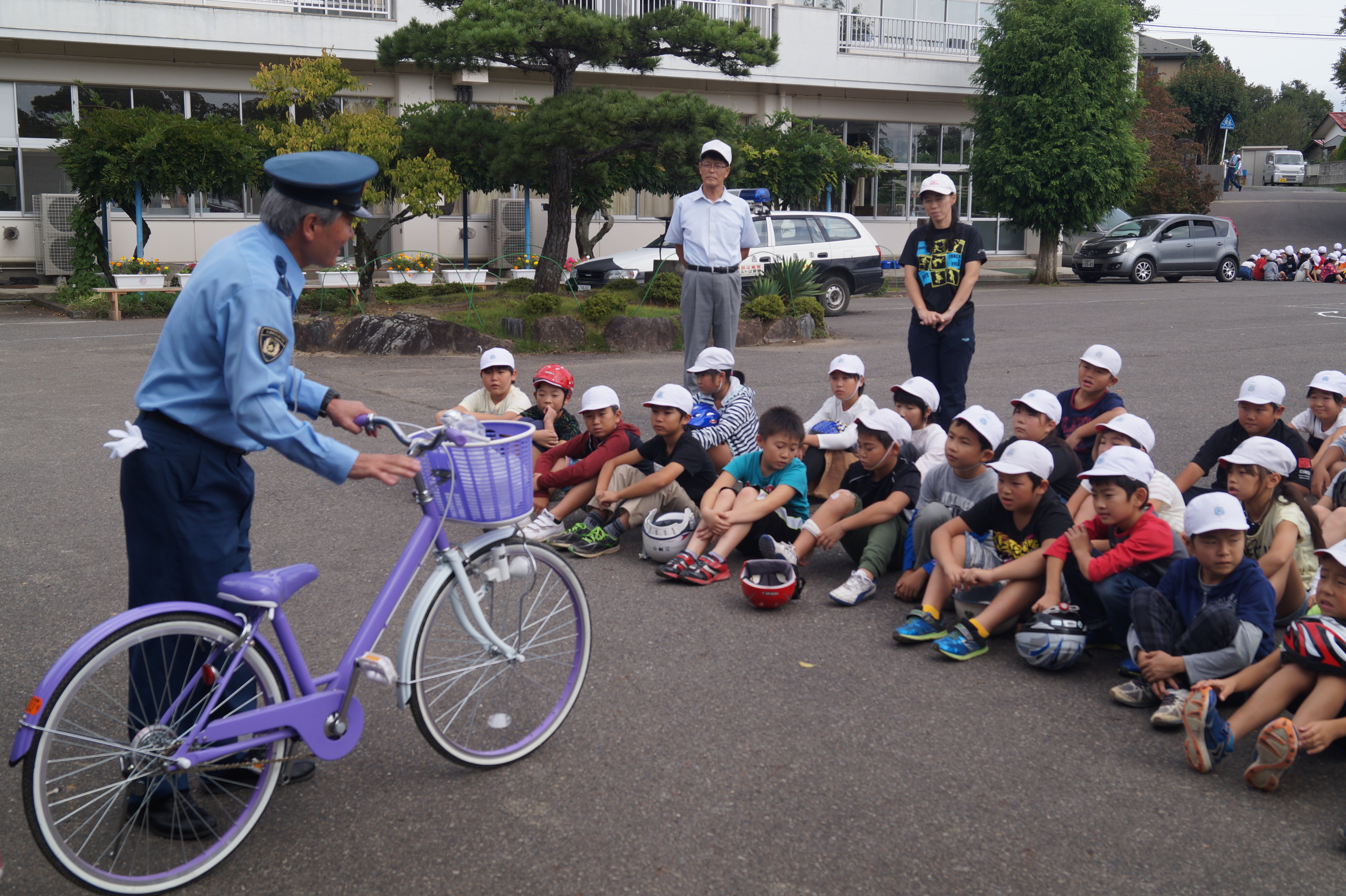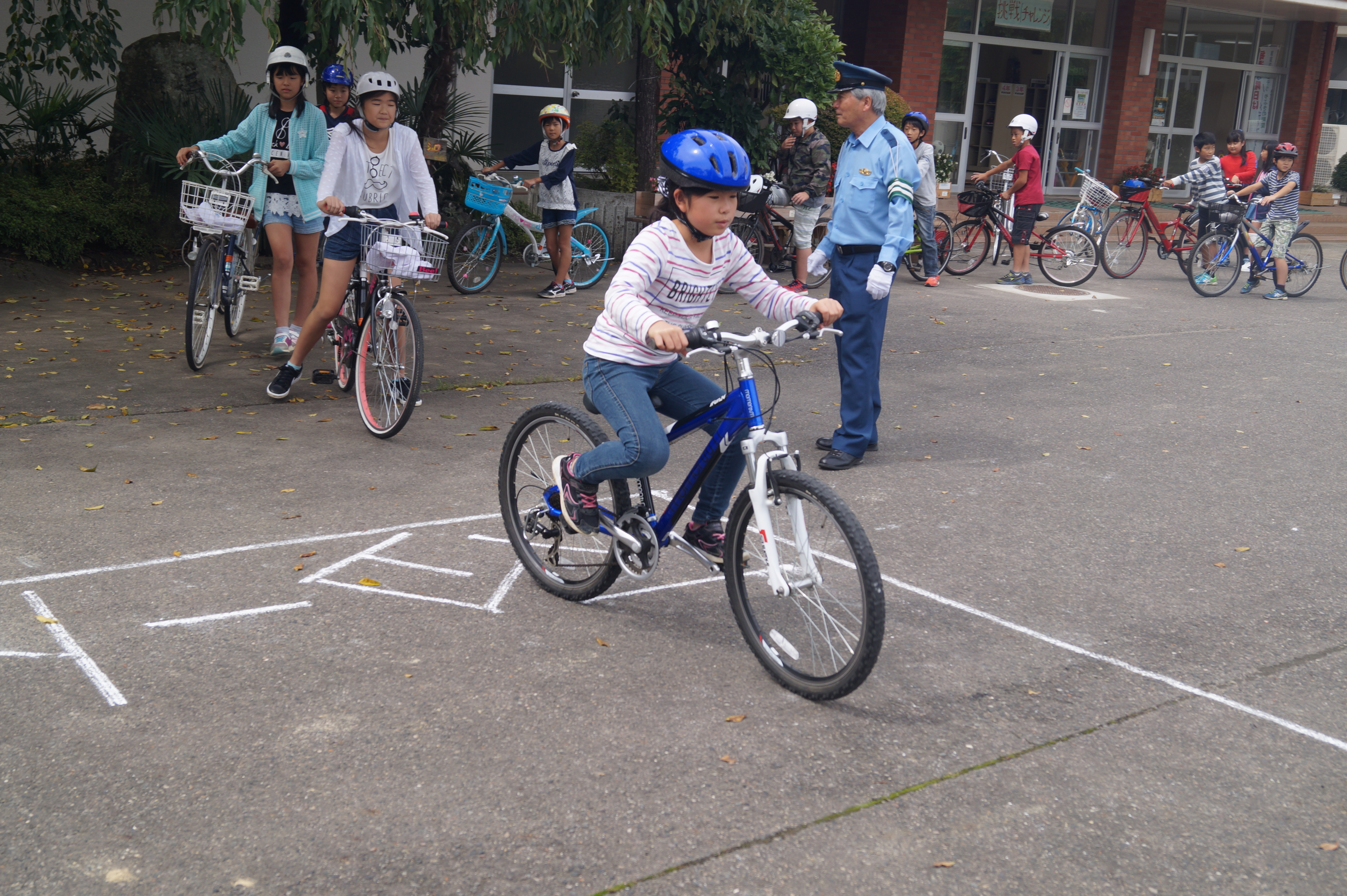 3~6年生は正しい自転車の乗り方につい教えていただきました。乗る前に自転車をしっかり点検すること、乗る時には後方を確認し、左側を運転すること、右折左折の際には手信号を用いること、しっかり標識を確認するなど、安全に乗るための様々な注意点について確認しながら、校庭の上に設置されたコースを実際に走りました。