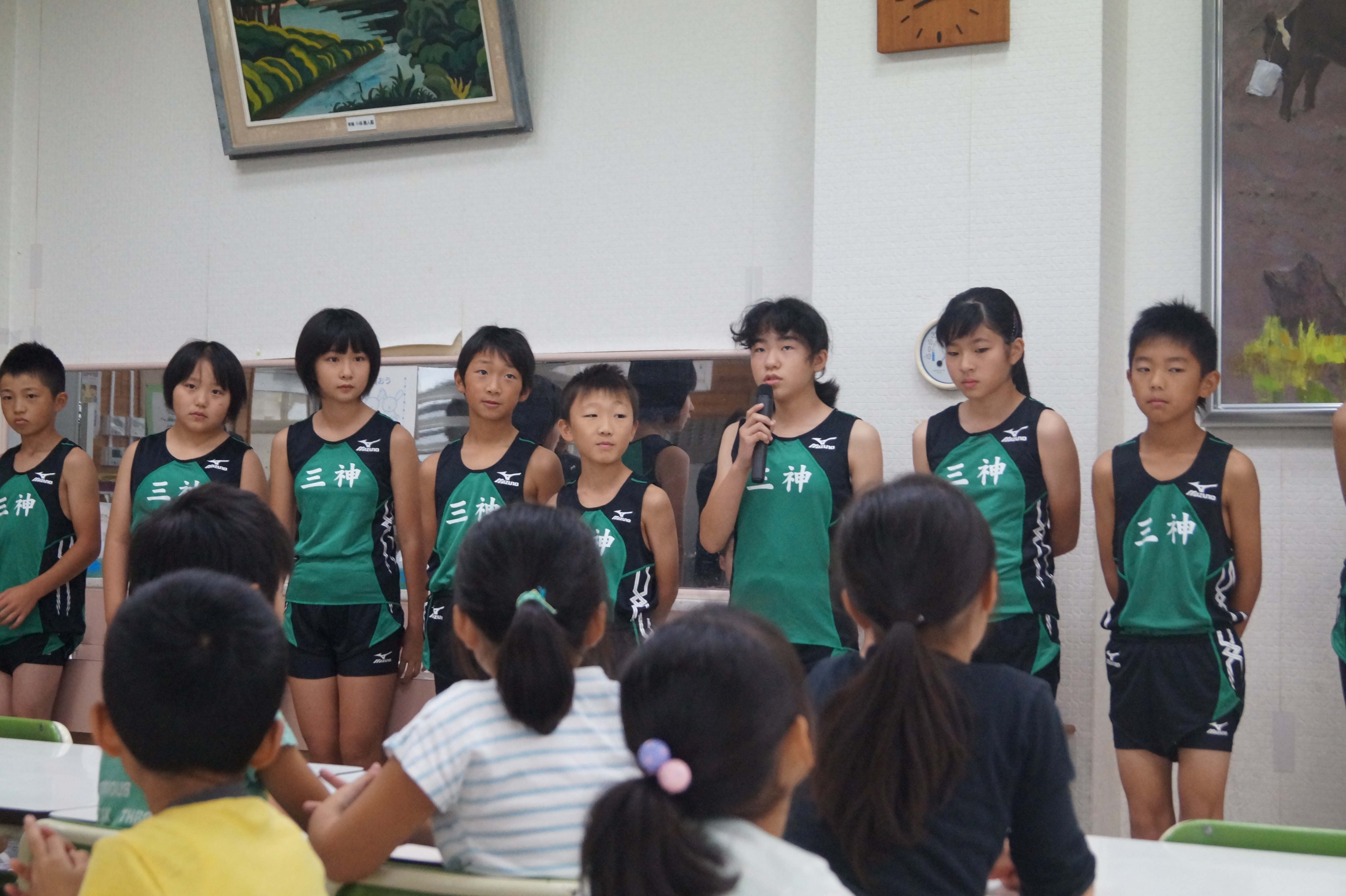 陸上選手壮行会が行われました。出場選手一人一人が、陸上大会での目標を話した後に、5年生を中心とした全校生からエールを送りました。
