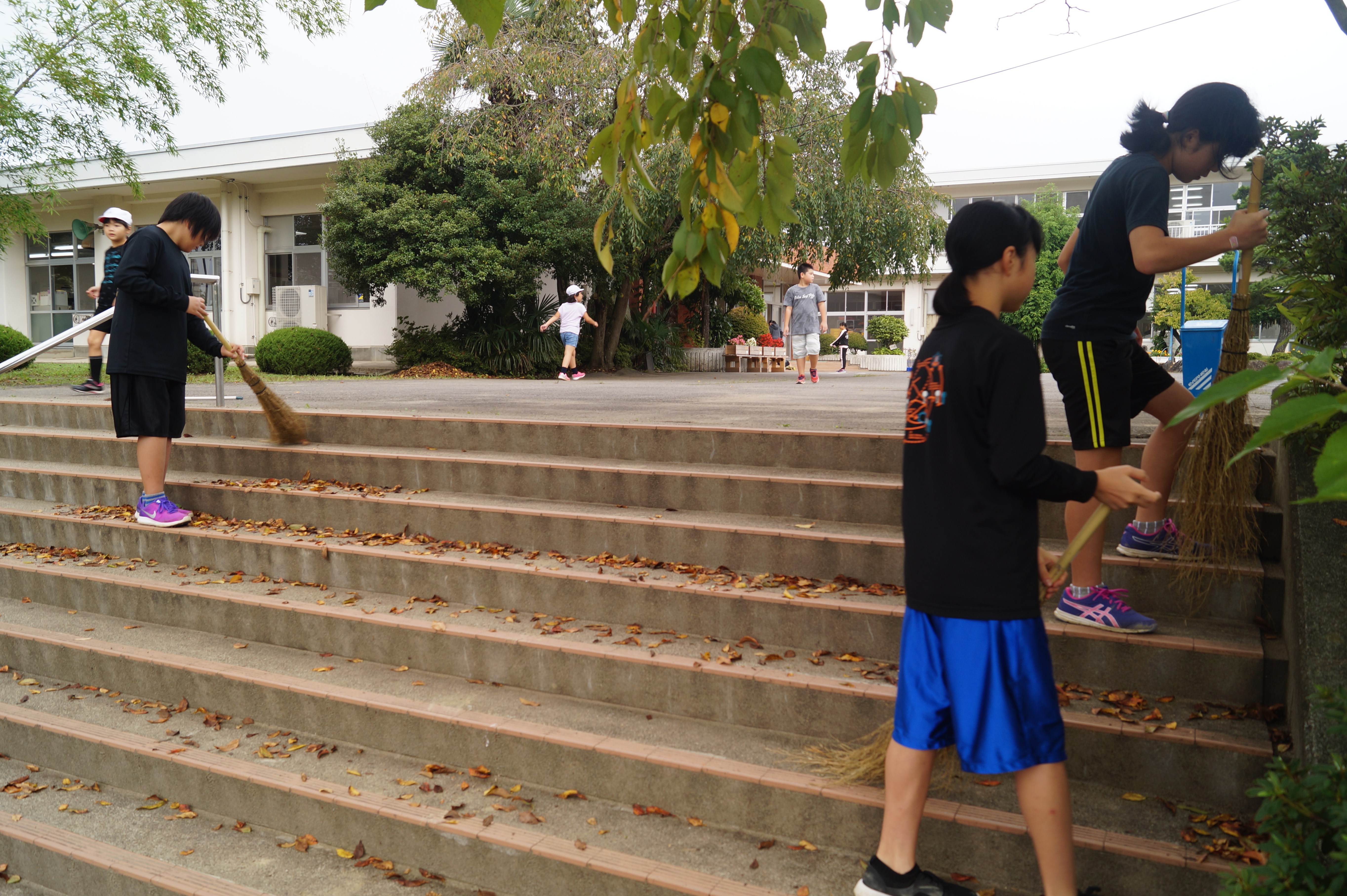 落ち葉を掃いて学校をきれいにしてくれている飼育園芸委員。