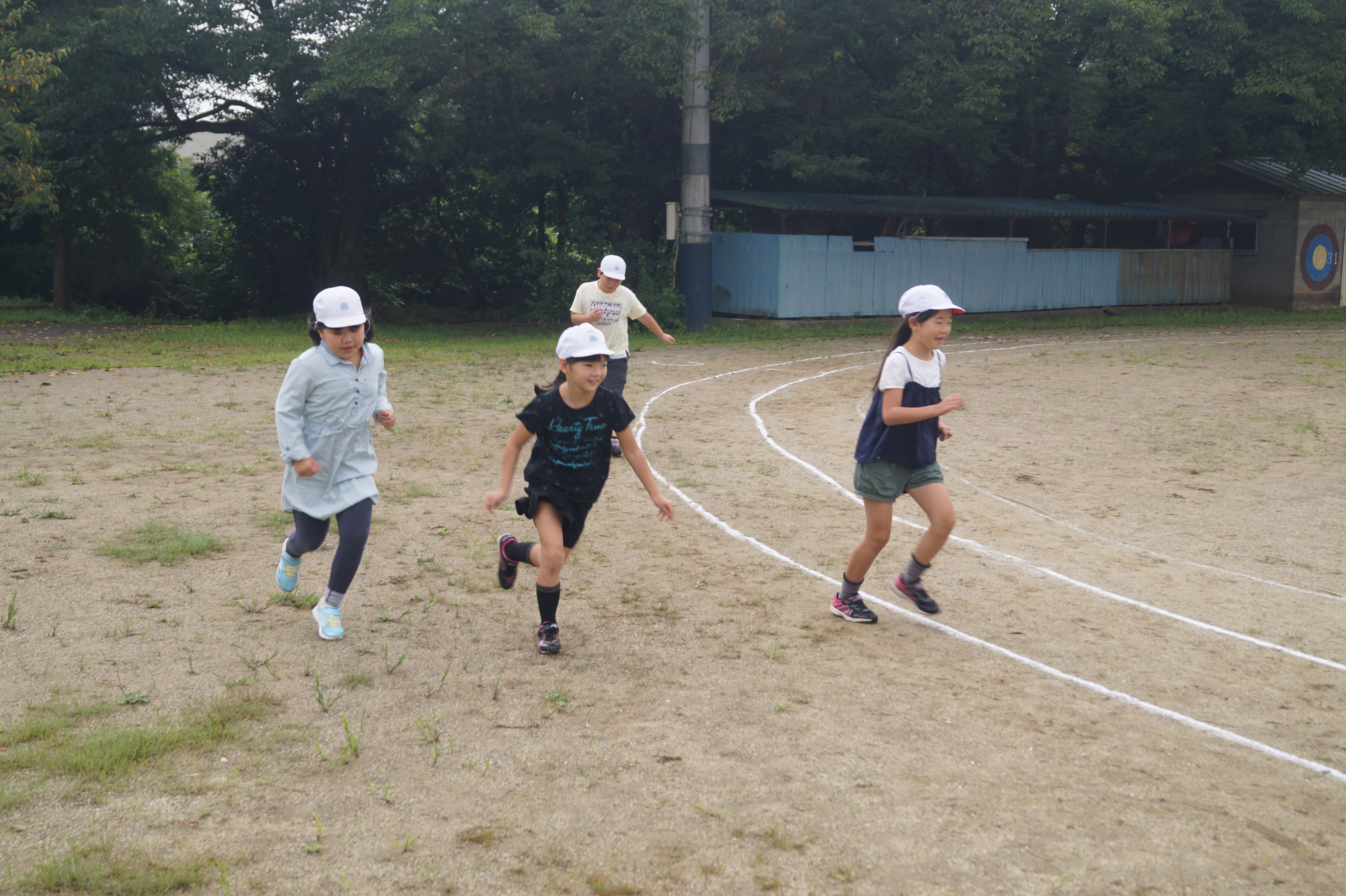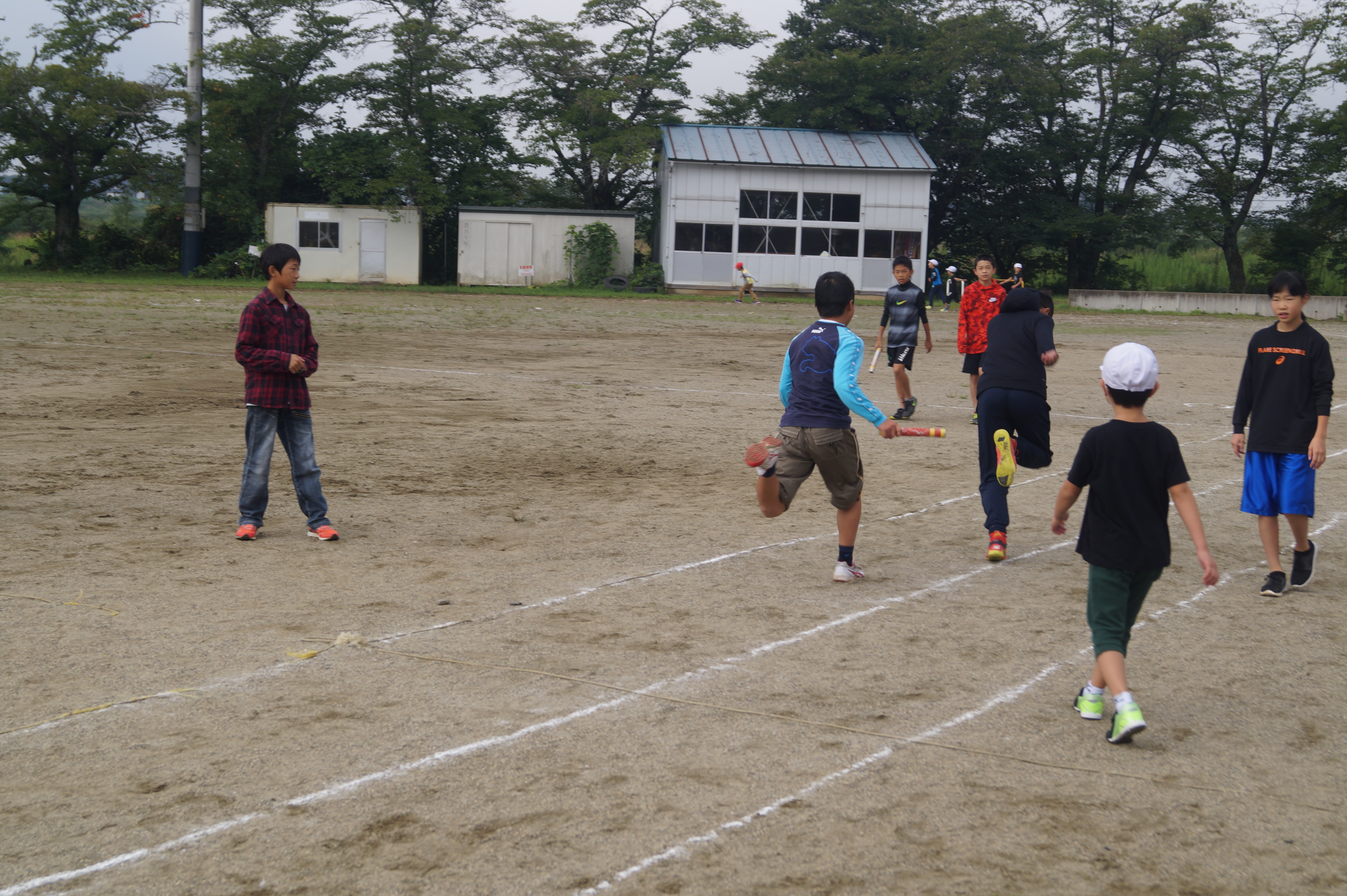 校庭を走って体を鍛える子。陸上競技会に向けてリレー練習に励む6年生。