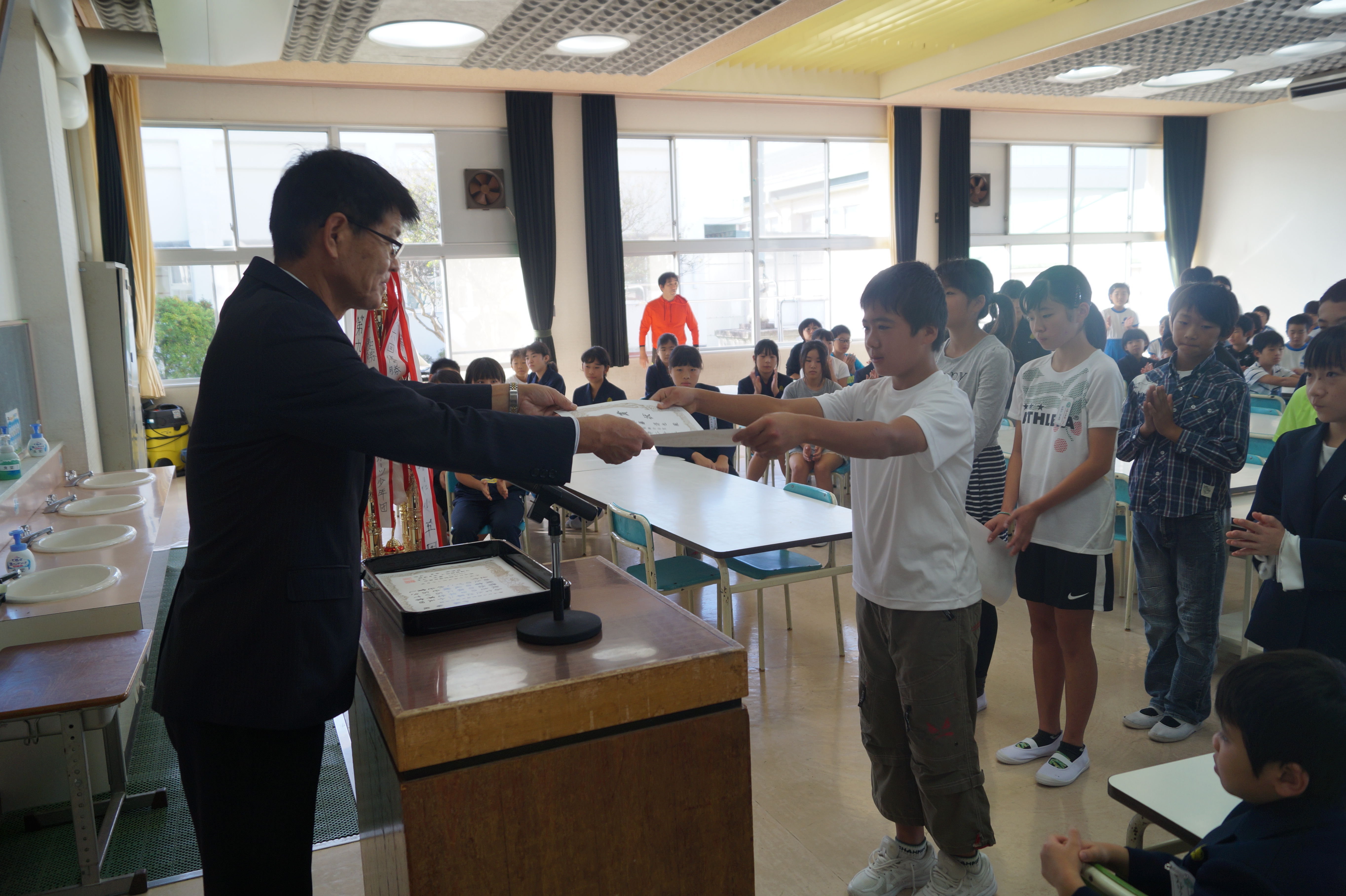 集会の後には、夏休み等に行われた各種コンクールの表彰を行いました。校長先生が各コンクールを頑張った子ども達をたたえるとともに、明日の陸上大会に向けて出場する選手にエールを送ってくださいました。
