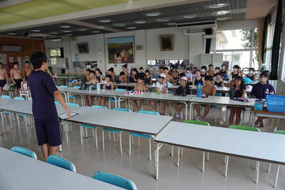 自然の家の担当の先生にあいさつをしたり、担当の先生から自然の家で生活する上で、気をつけてほしいことを聞いたりしました。