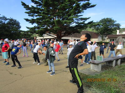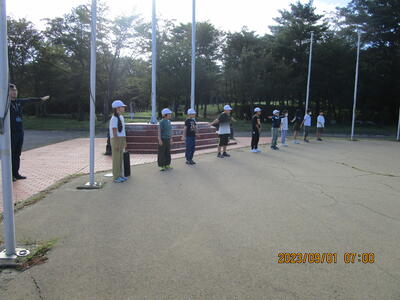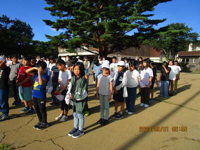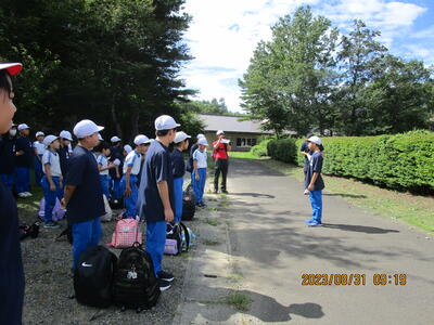 三神小の他に、白河一小、みさか小の子どもたちも参加し、ラジオ体操を行ったり、担当の先生から「防災の日」についてのお話を聞いたりしました。