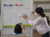 授業参観(すみれ編) 2022年6月24日 14時50分 算数の学習。一人ずつ学習を進めます。まずは、100より大きな数の学習から。 図を使って考えながら、大きな数のたし算もクリアです。 先生との学習を待つ間は、タブレットでの学習。どちらも集中した取り組みです。