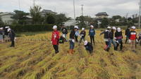 近くの水田で、鎌を使っての稲刈り体験