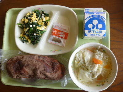 メニューは、「ココア揚げパン、ほうれん草の卵チーズ和え、ワンタンスープ、牛乳、ミルメーク」です。