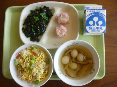 「ちらし寿司、桜シューマイ、菜の花とわかめの和え物、すまし汁、牛乳」です。