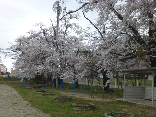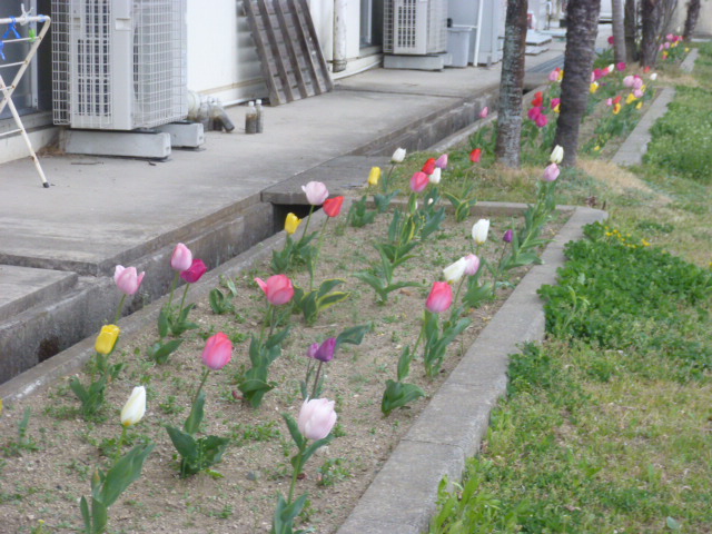 校庭の桜が満開になり、チューリップの花も綺麗に咲いています。
