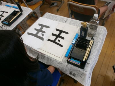 3年生は書写の学習で、「玉」という文字を毛筆で書く練習をしました。