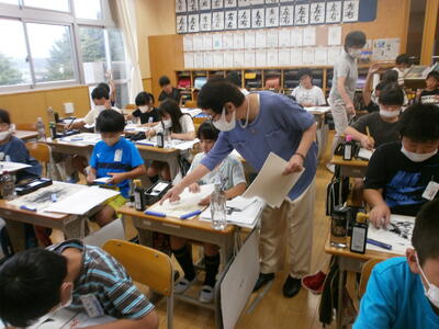 今日も、町内の先生を講師としてお迎えし、横画、縦画、はらいねどを丁寧にご指導いただきました。3年生同様、最初に書いた文字と最後に書いた文字を比べると、ご指導いただいた文字がとてもきれいに書けていました。集中して署に向かう姿勢はさすが4年生です。ご指導、ありがとうございました。