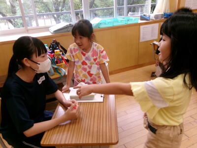1・2年の教室で子どもたちと一緒の時間を過ごしています。3人とも人と関わる仕事に興味があるとのこと。ぜひ、学校の先生になってほしいものです。