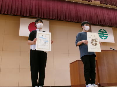 ※式終了後に、吹奏楽部の表彰を行いました。夏休み中に県の吹奏楽コンクールと地区の音楽祭に参加し、素晴らしい演奏を披露しました。次は県の音楽祭です。がんばれ!!吹奏楽部。