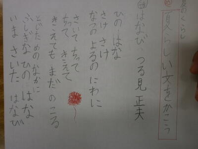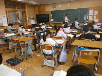 3年生は、夏らしい文を書くために、参考の文を視写し、夏らしい言葉をたくさん探していました。