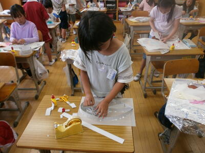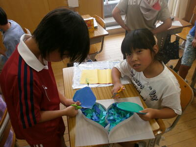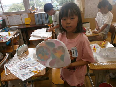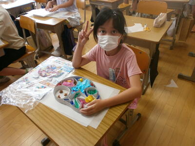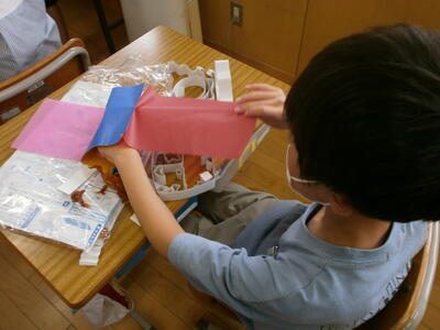 3年生が、図工の時間に「光のサンドイッチ」という題材で作品を作っていました。段ボールで作った思い思いの形の中にきれいな色紙を入れ、薄紙で透かして楽しむ作品です。
