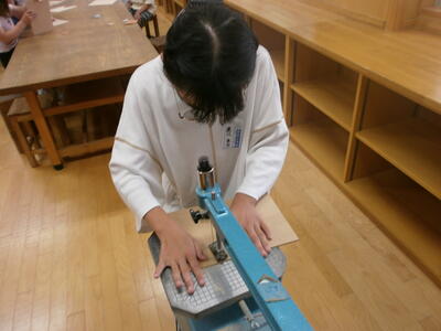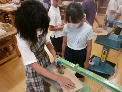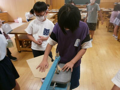 5年生が、図工の学習で糸のこで木を切り、作品を作っていました。糸のこのよさは、通常ののこぎりと違い、曲線が切れるところです。5年生は慎重に糸のこを扱っていました。