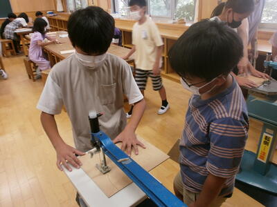 高学年になると、使用する道具が高度なものになってきますが、担任の指導の下、落ち着いて安全に使えるところがさすが5年生です。糸のこを使うことで作品の幅も広がりますので、活用していきましょう。