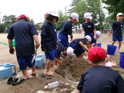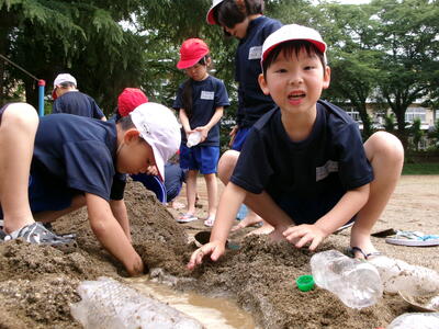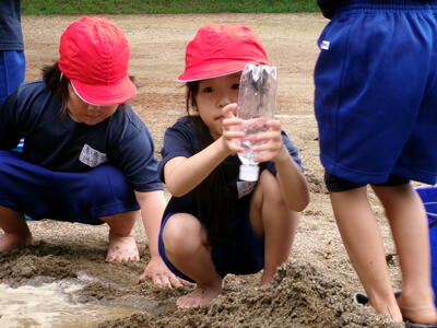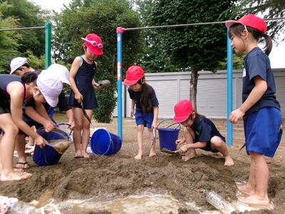 1年生が生活科の学習で水鉄砲遊びと砂遊びをしていました。幼稚園ではたっぷり経験していたと思いますが、小学校になってからは初めてかもしれません。まさに全集中で砂と向き合っていました。