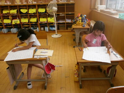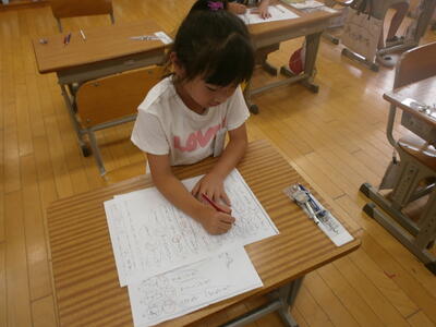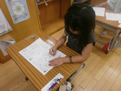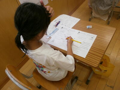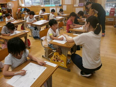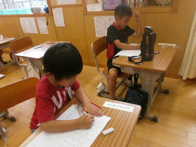1年生が、1学期に学習した内容をプリントで学習していました。小学校に入って3ヶ月。学習している姿も小学生らしくなりました。