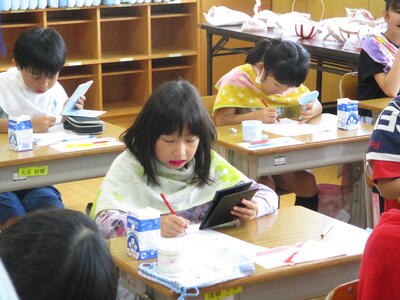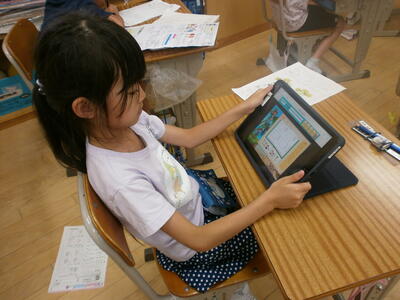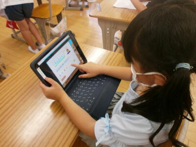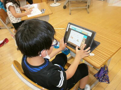 2の2をのぞいてみると、1学期に学習したプリントやドリルの直しをしながら、タブレットのすららドリルにチャレンジしていました。昨年度から使っているすららドリルなので、取り組みもスムーズです。どんどん問題を解いて、1学期のまとめをしていきましょう。