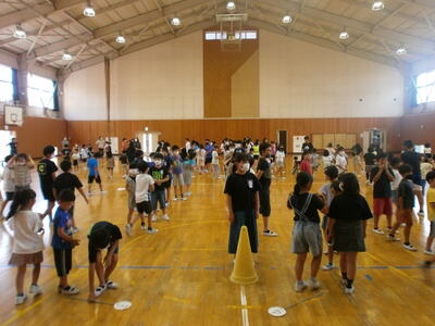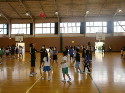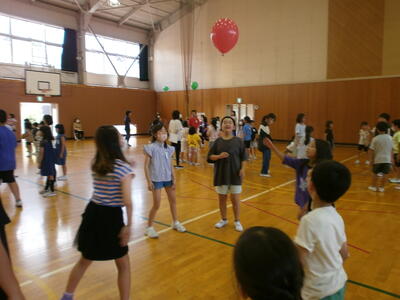 体育委員会が考えた風船バレーボールを縦割り班で行い、