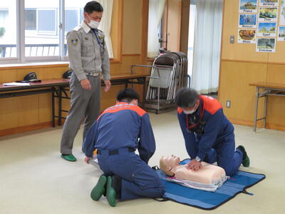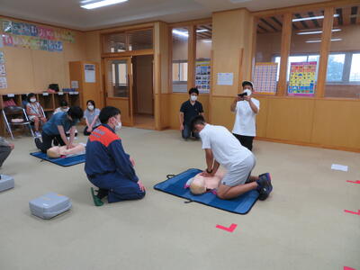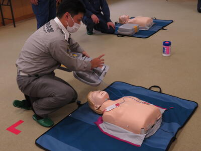 講師の矢吹消防署員の方々に、胸骨圧迫(心臓マッサージ)の仕方やAEDの使用法についてご指導いただきました。