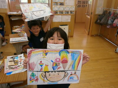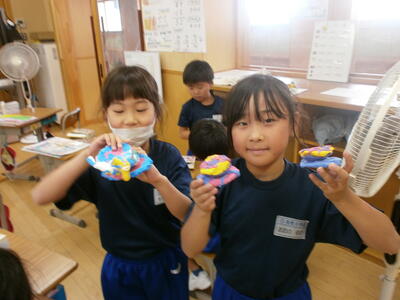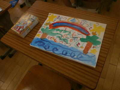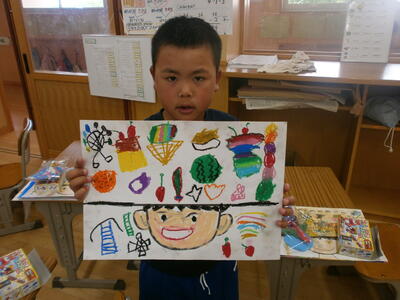 2の1では、1学期に描いた絵や作った作品をまとめていました。みんな上手にできています。
