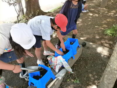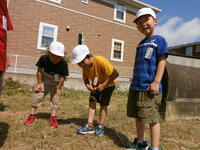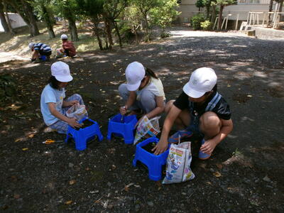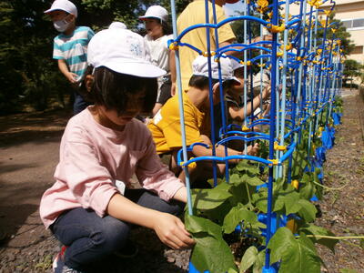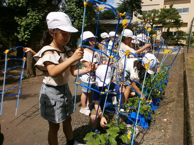 学校に帰ってきてからは、育てているアサガオに支柱を立てました。1年生もアサガオもすくすく大きくなっています。