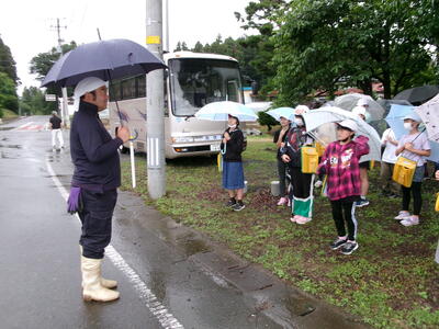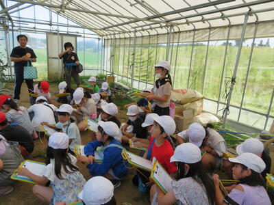 5年生はあいにくの雨の中でしたが、大きなハウスの中で、青木さんにおいしいトマトを作る工夫などについて懇切丁寧に説明いただきました。5年生の態度が立派だったとお褒めの言葉をいただきました。