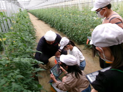 3年生も、実際に育てているトマトを見せていただき、積極的に質問することができました。