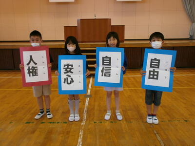 今日の全校集会は、人権について考える会でした。矢吹小学校では、毎月1日は人権の日として、人々の人権を尊重しようと呼びかけていますが、今日はあらためて全校生で人権について考えました。