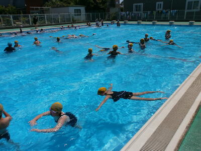 今日から本格的に水泳の学習が始まりました。今日は、5・6年生が初泳ぎをしました。